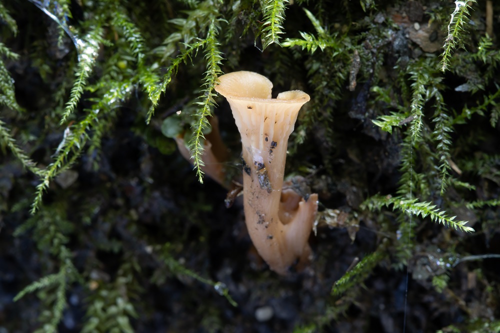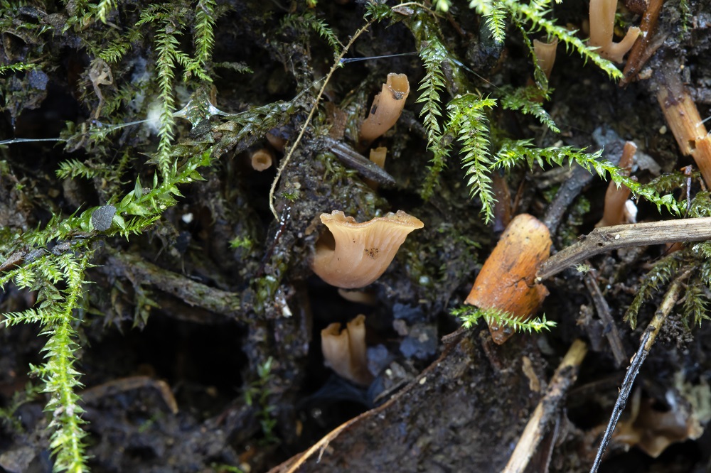 Ich vermute es ist etwas aus der Ordnung der Cantharellales. Leider bin ich damit absolut nicht vertraut und auch eine google Suche ergab nichts erfreuliches.
