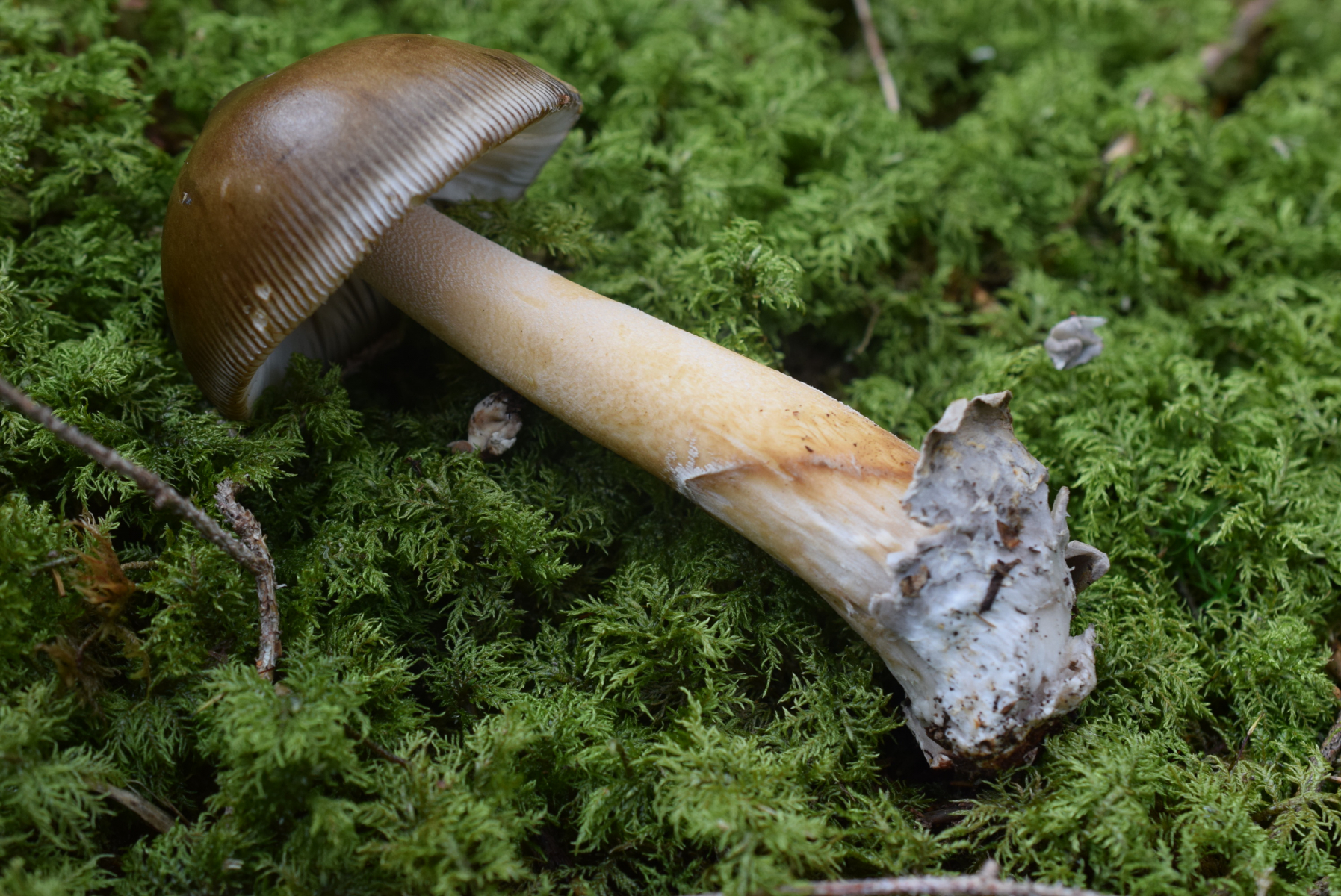 Etwas weiter ein erwachsene Fruchtkörper Amanita sp , an dichte Bemooste Boden gefunden