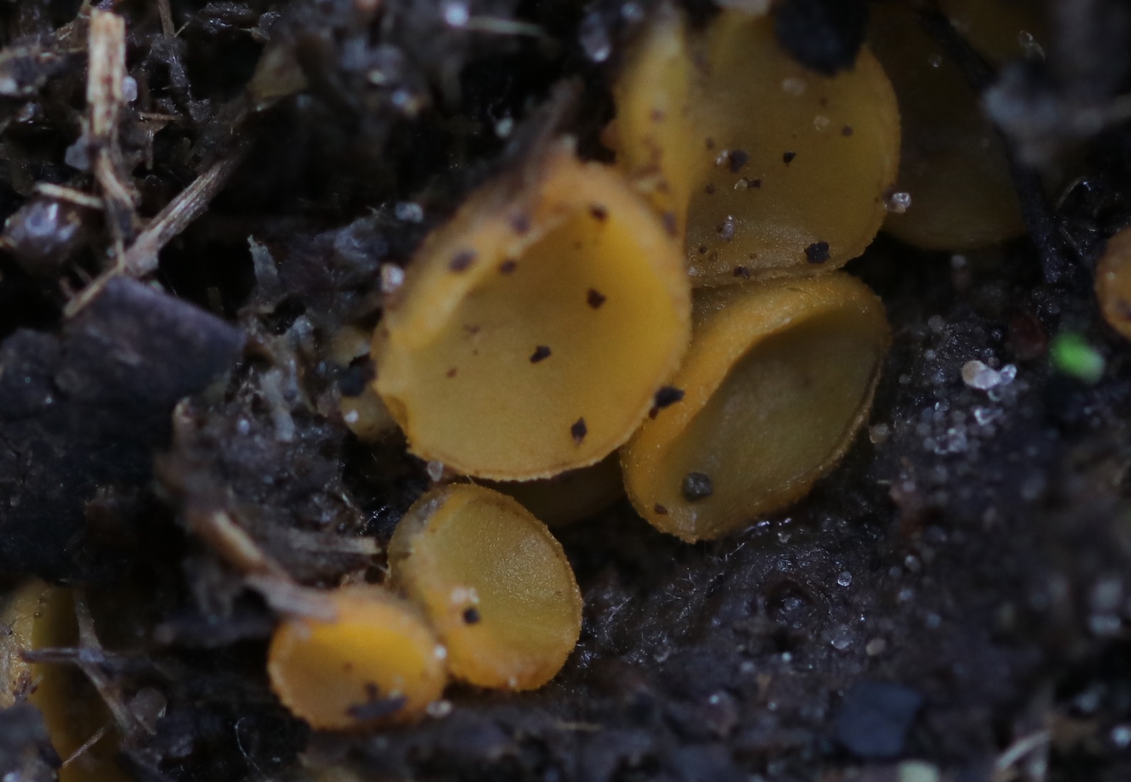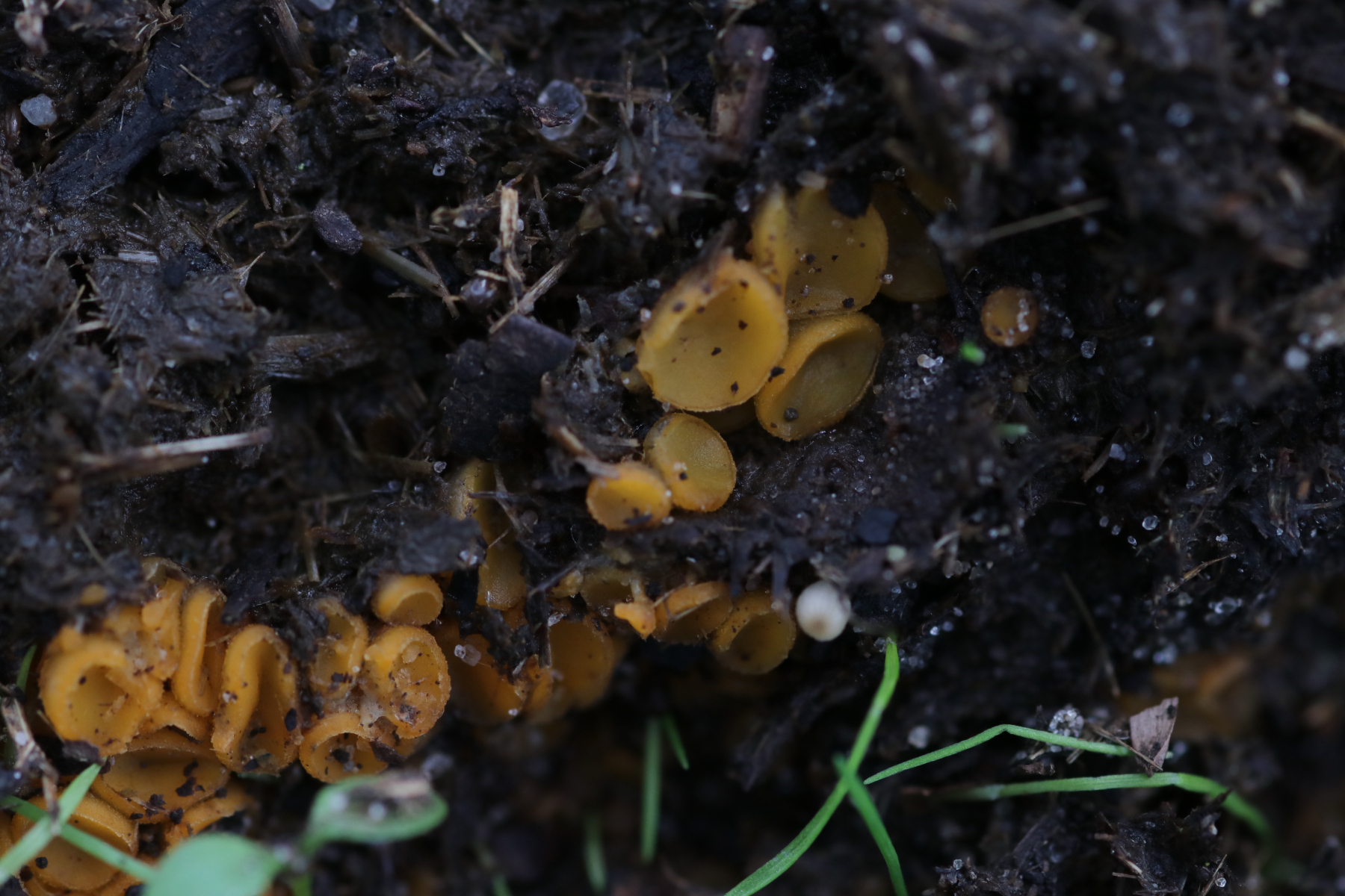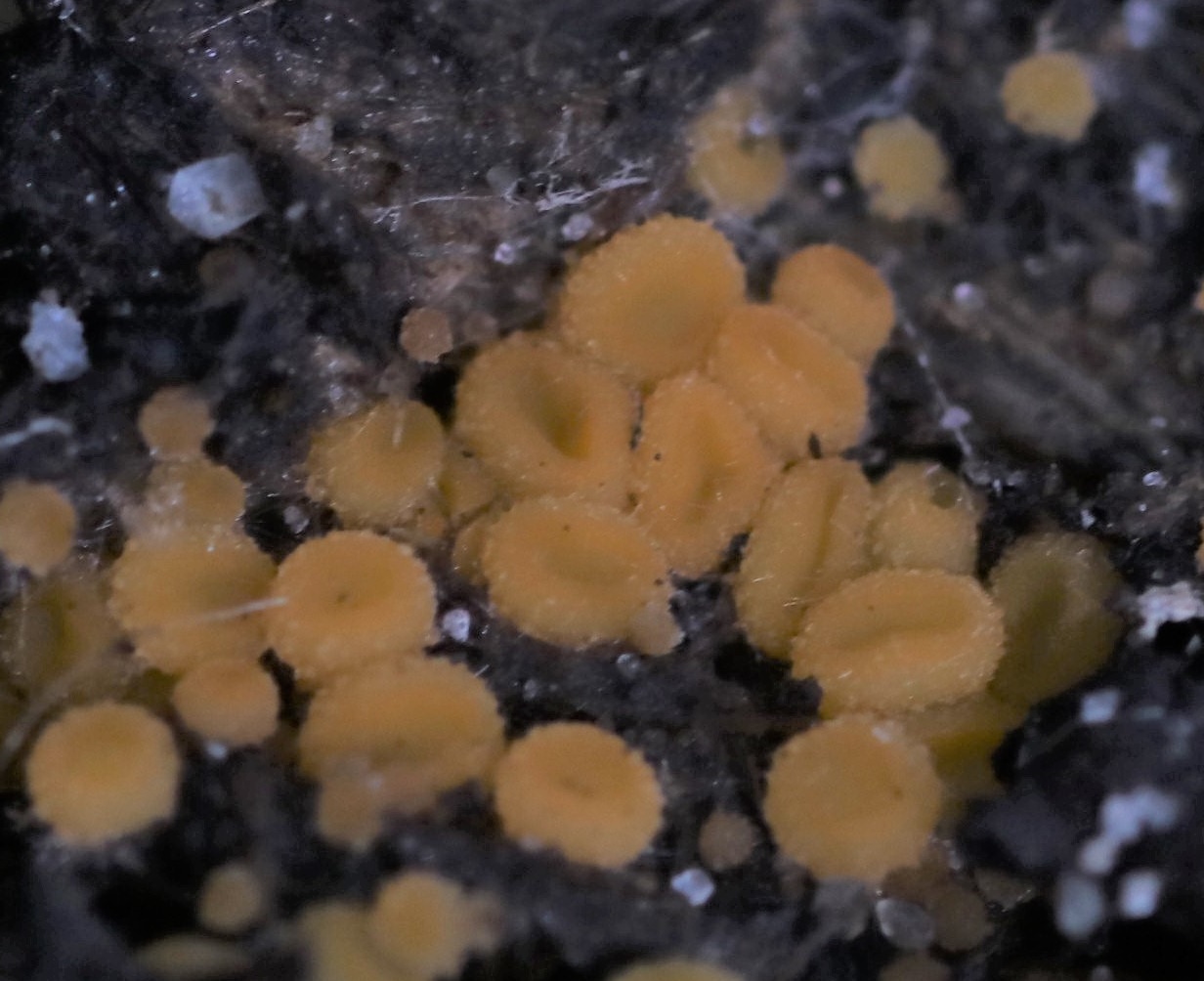auf einem kleinen Spaziergang durch das Witte Venn leuchteten mir auf zahlreichen Gallowaydunghaufen gelbe Becherchen entgegen, weshalb ich nicht widerstehen konnte....Auf dem Dungstückchen, das ich mitnahm, waren leider nur unreife Fruchtkörper; ich habe versucht sie reifen zu lassen, aber das wird nun keinen Zweck mehr haben: Für unzählige Springschwänze scheinen Cheilymenias so etwas wie eine Leibspeise zu sein.
