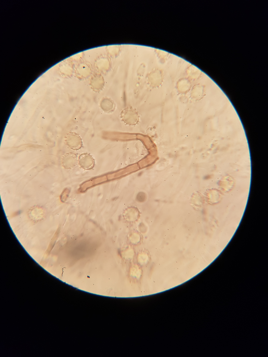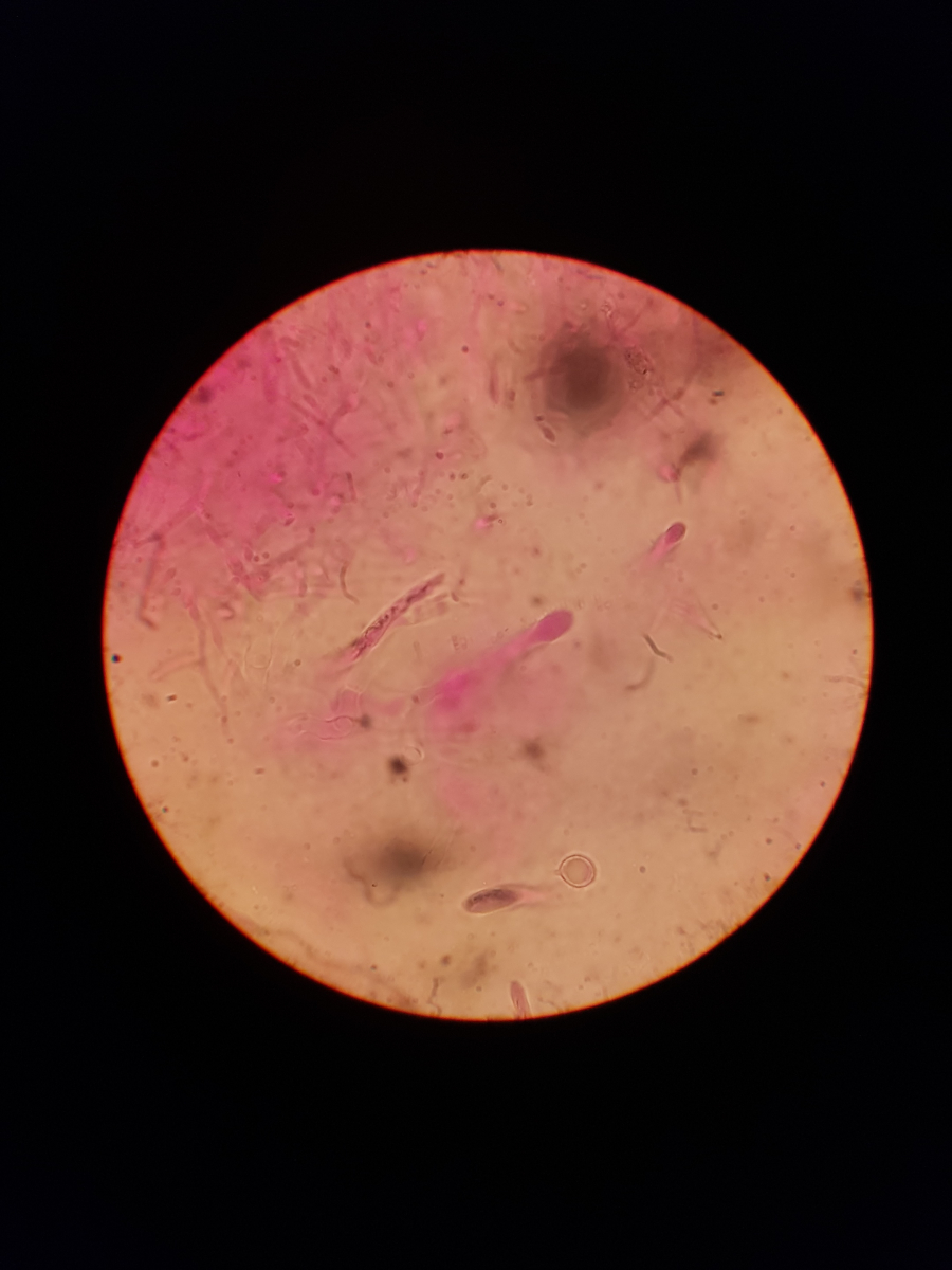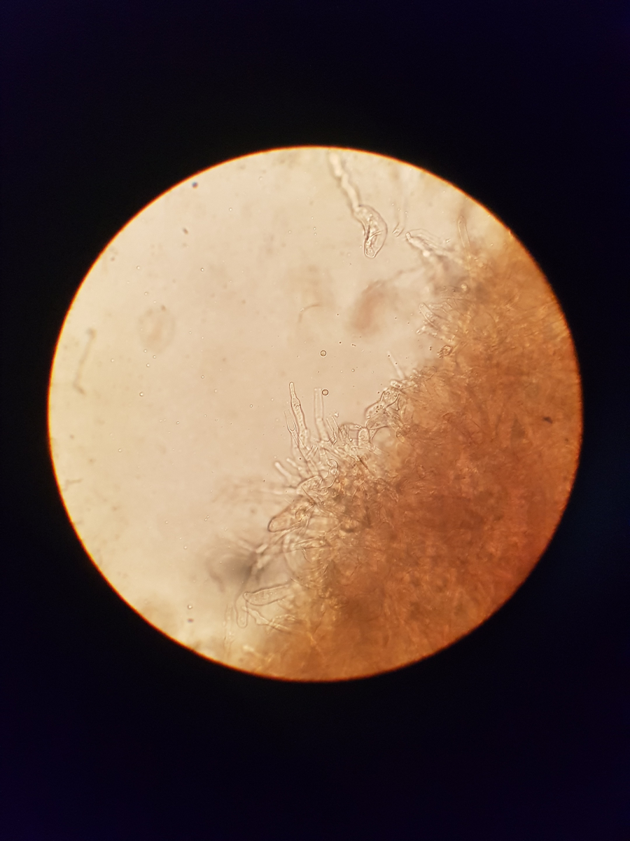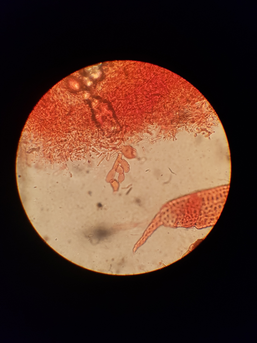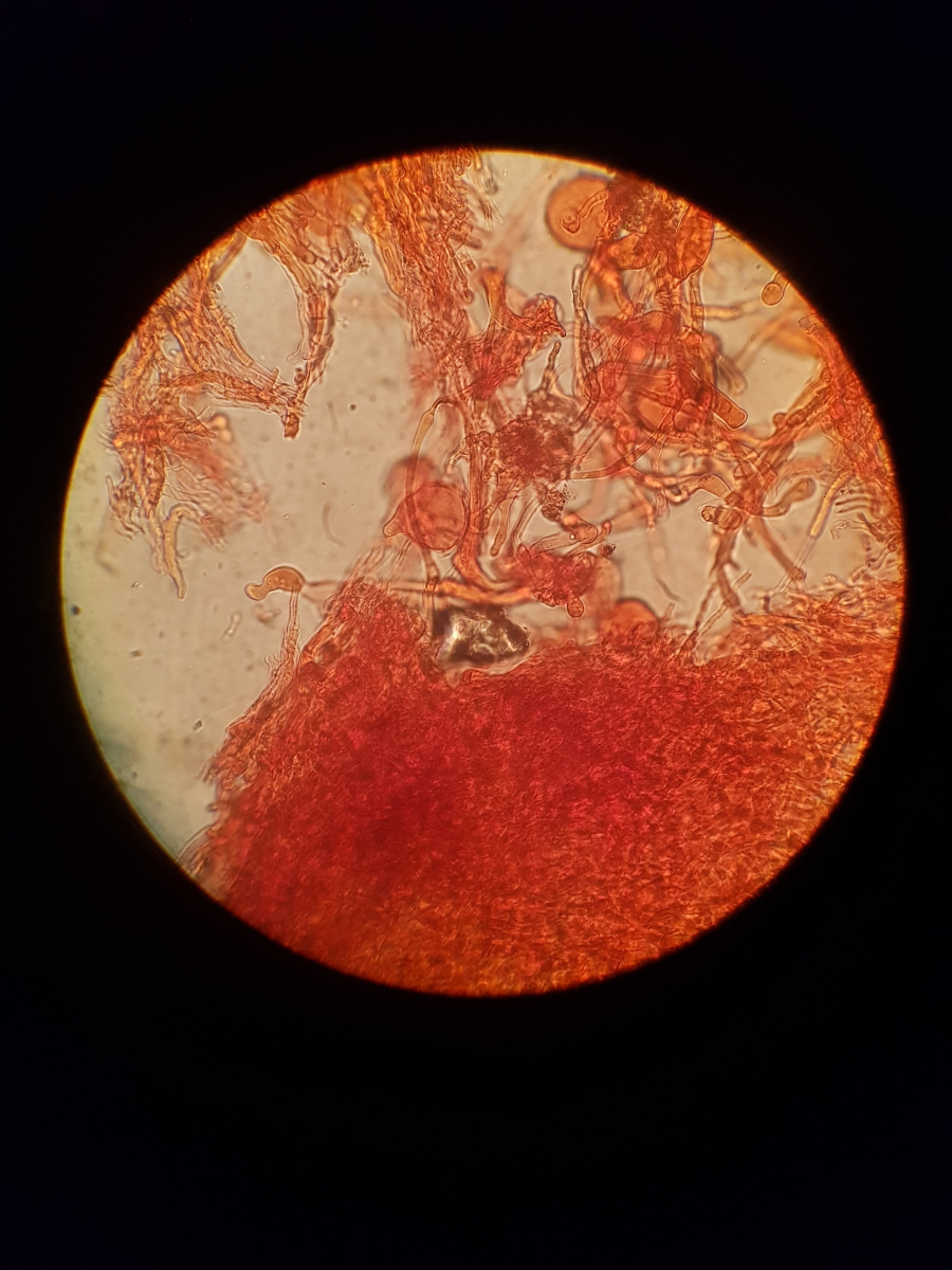 11. und zum Schluss habe ich noch sowas in der Huthaut gefunden. Ich bin echt überfragt, da ich vier Strukturen ausmachen würde. Die blasenförmigen, die keulenförmigen, die Pileozystidien? und folgende: