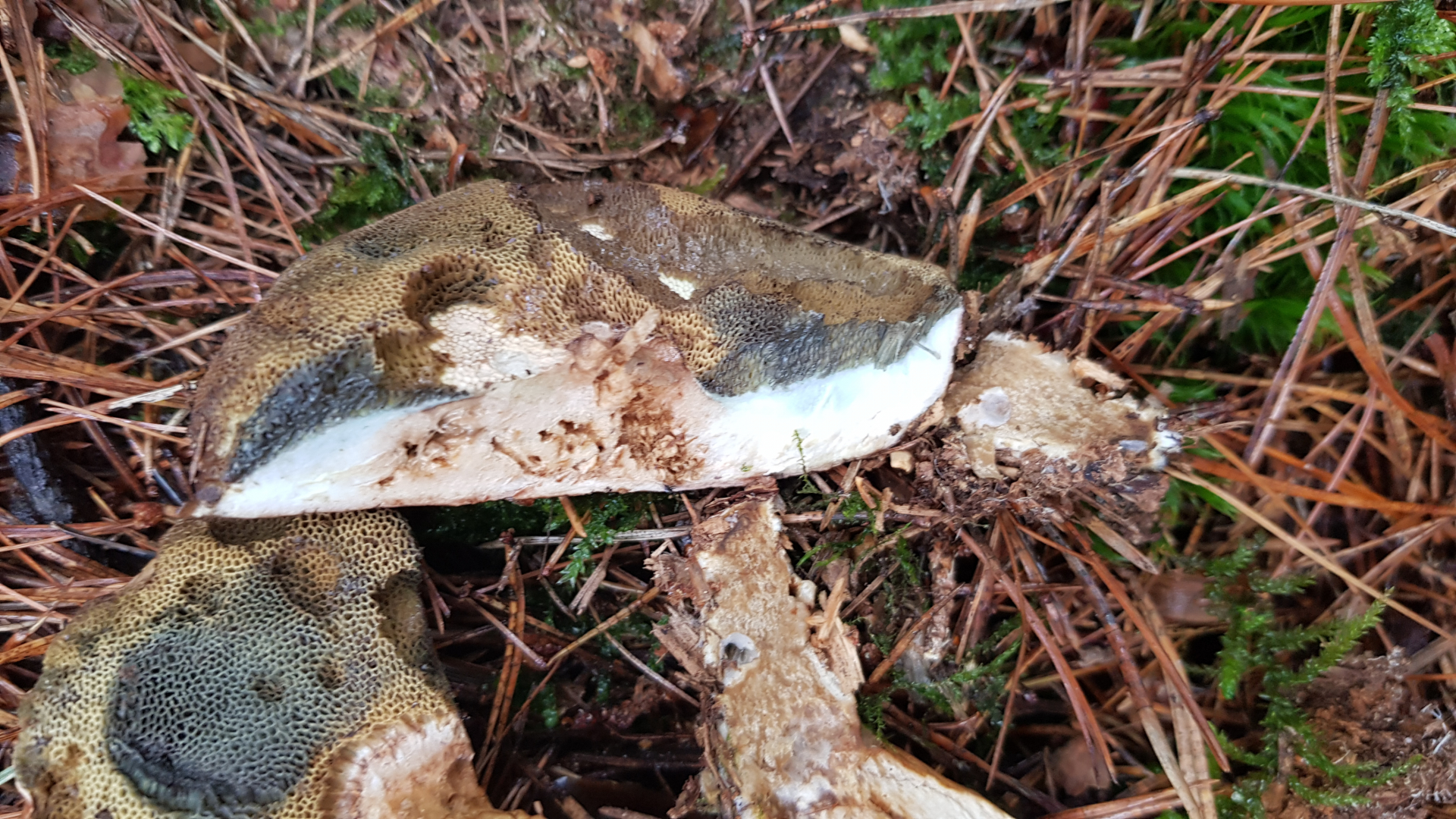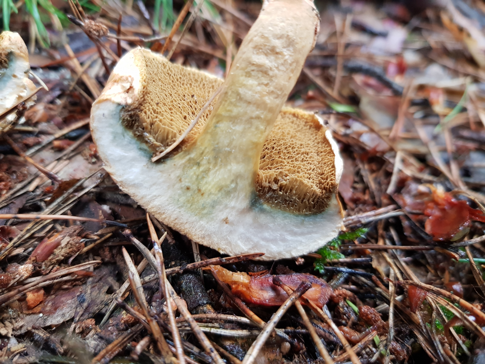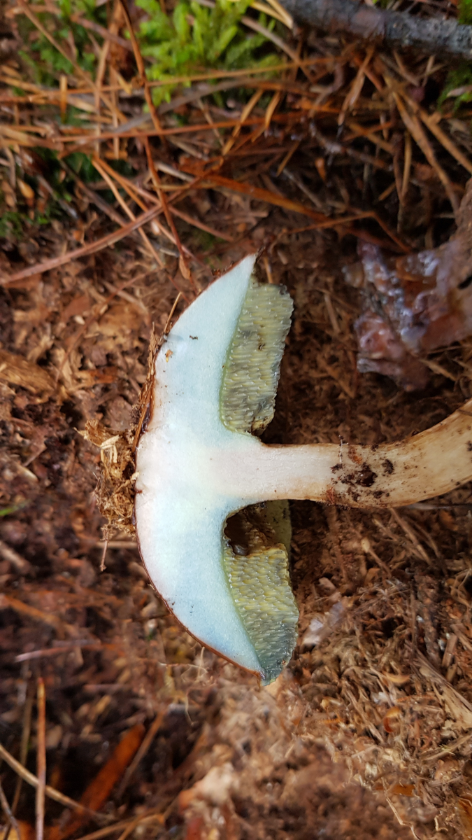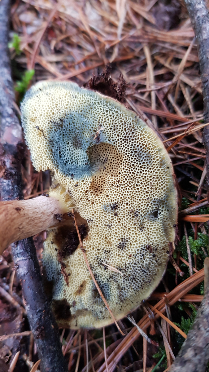 Röhren/Poren grüngelb, Poren klein, auf Druck schnell blauend