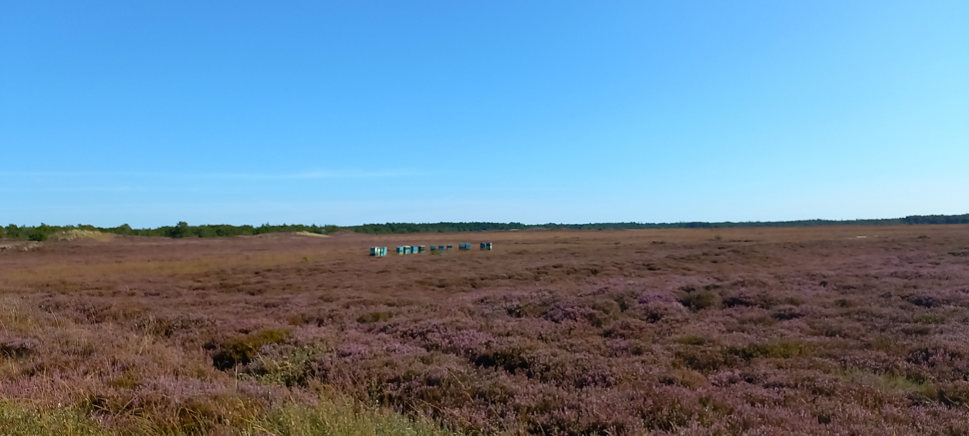 Wiese mit Heidekraut und Bienenkörbe.
