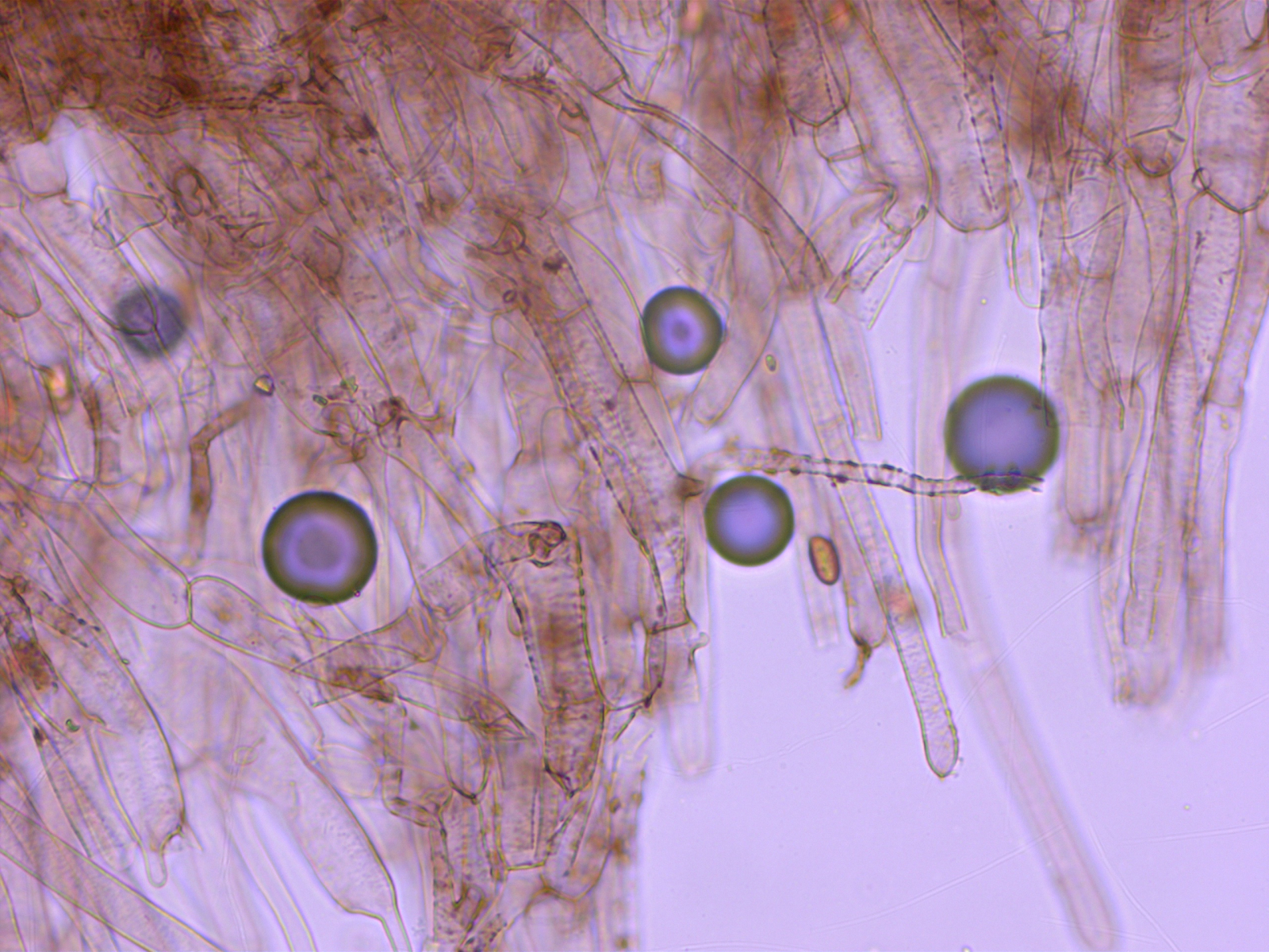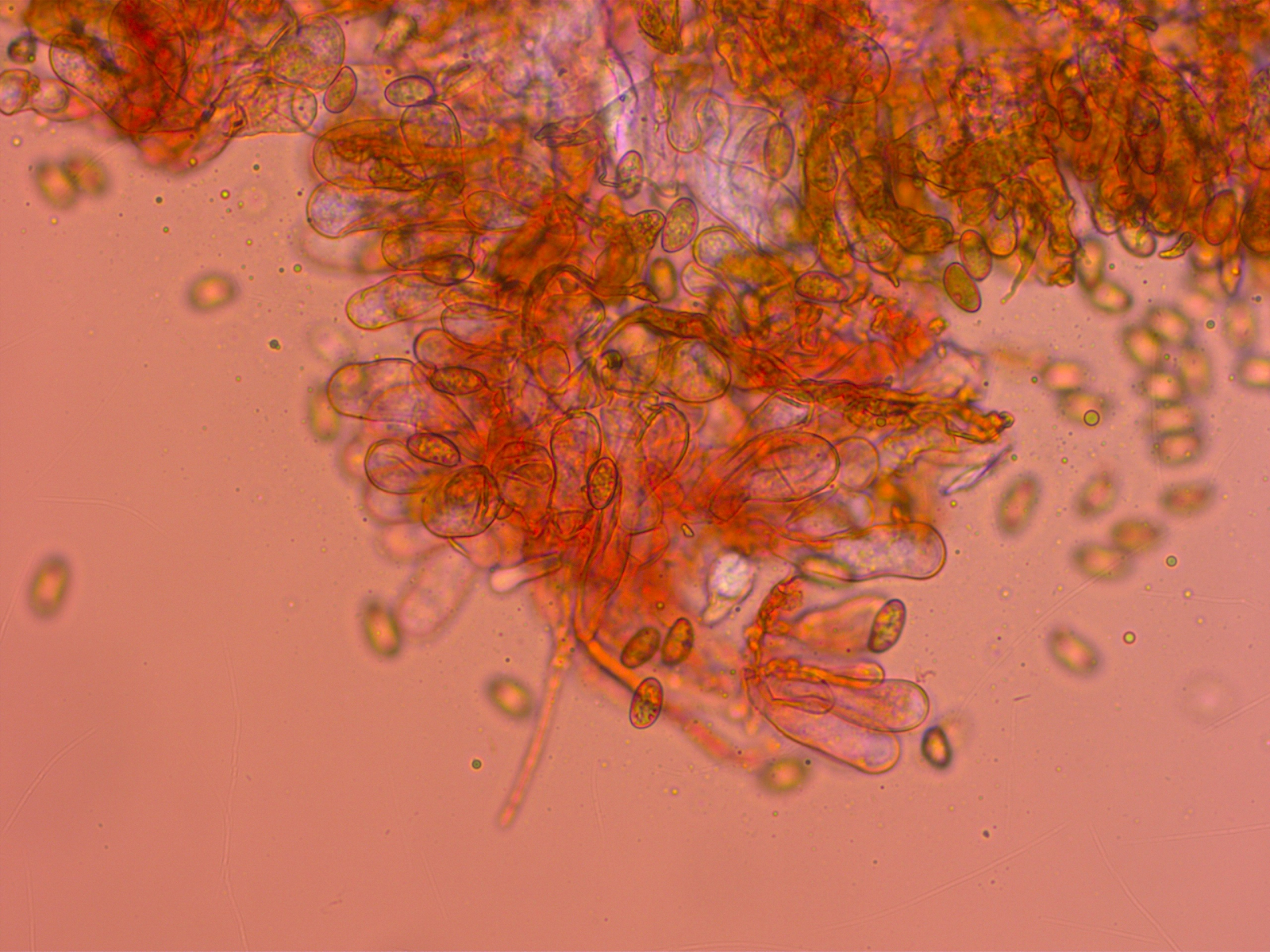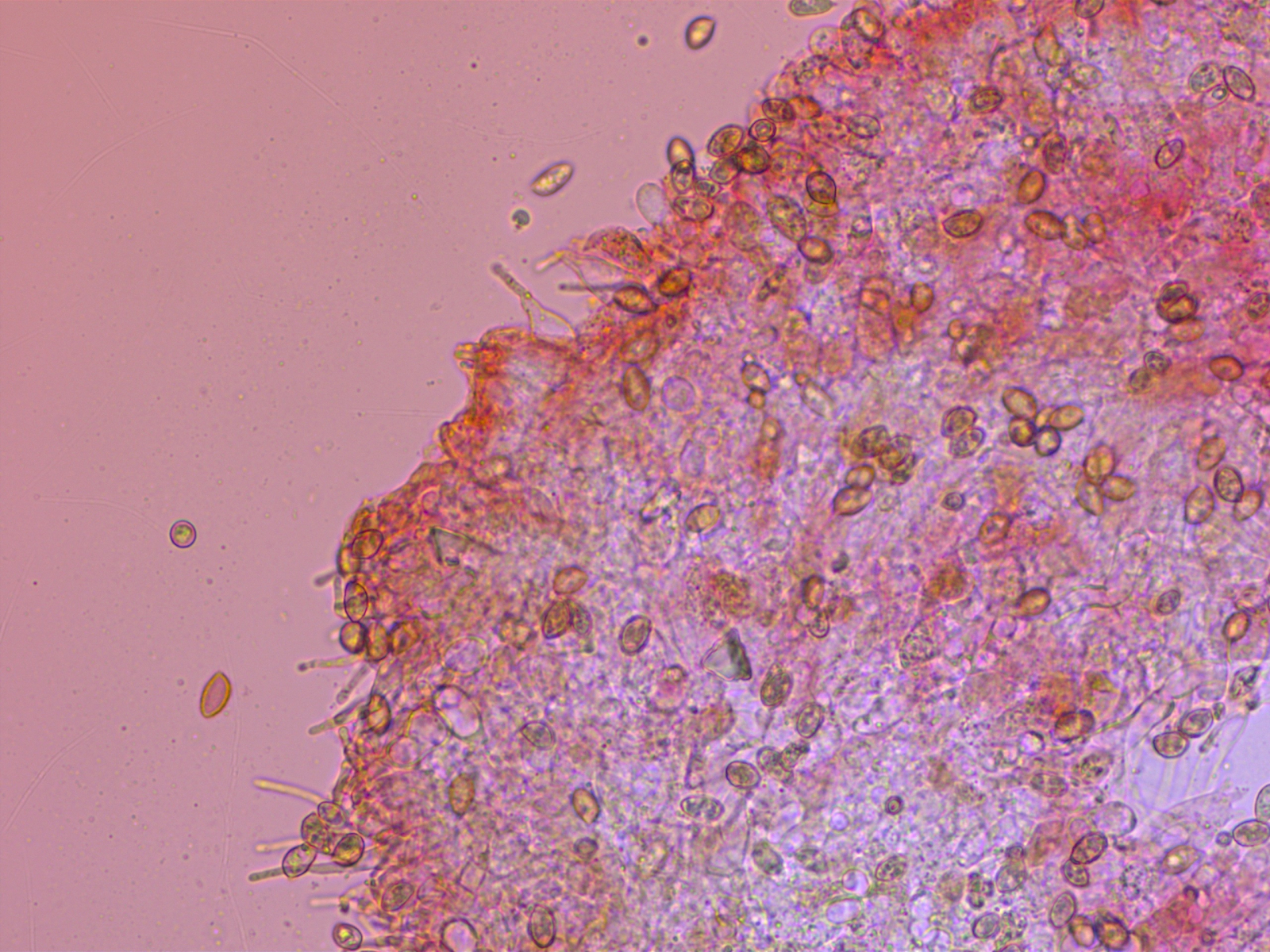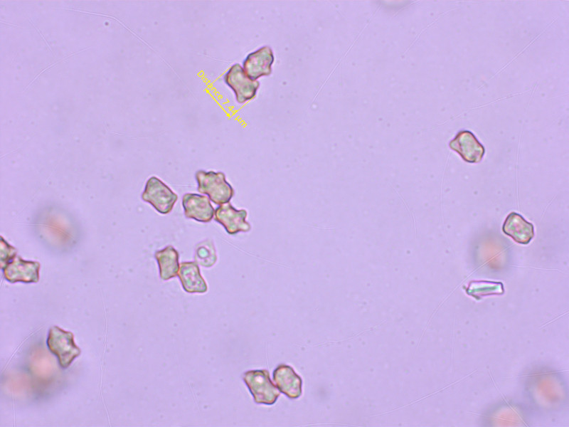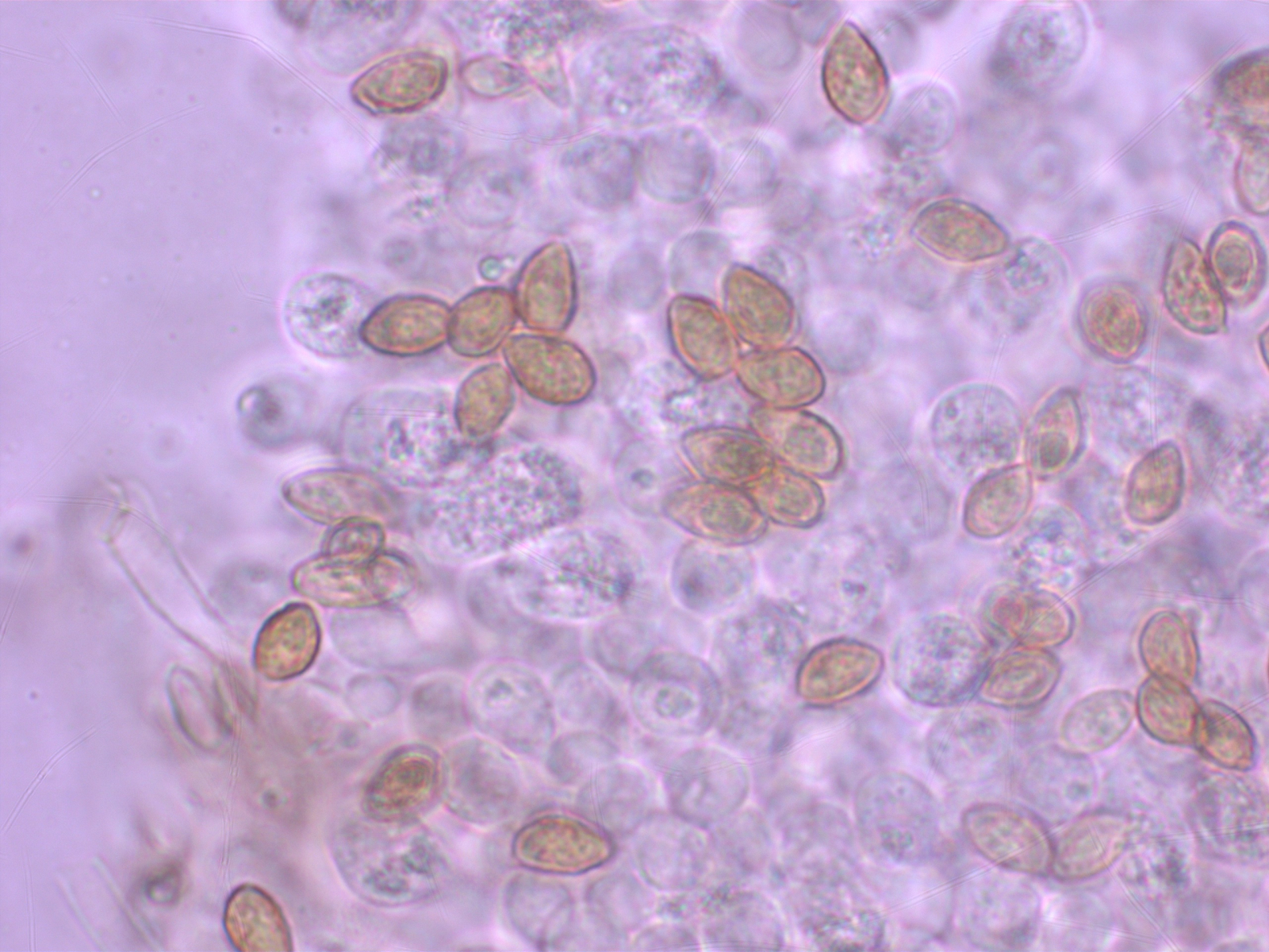 Sporen teils deutlich höckerig, teils nur eckig, 6.8-7.6-8.4 x 4.4-5.2-5.8 µm, Q = 1.32-1.48-1.64