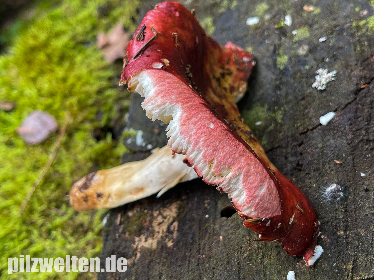 Huthaut nur am Hutrand abziehbar. Hutfleisch direkt unter der Huthaut deutlich rosa verfärbt: