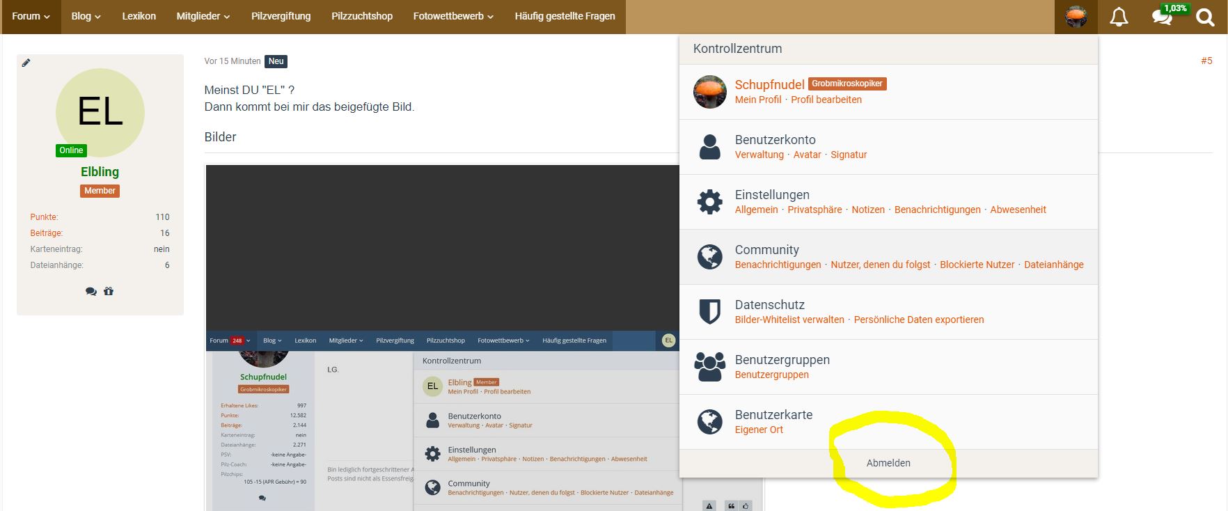 Scheint als würde bei einigen Bildschirmauflösungen das Overlay nach Klick auf den Avatar nicht richtig angepasst. Dann sieht man den Abmelde-Button wirklich nicht. Workaround wäre die entsprechenden Cookies im Browser zu löschen. Oder einfach angemeldet bleiben. Ich logge mich hier eigentlich nie aus, weil ich den Vorteil darin nicht sehe. Aber wie gesagt - Browser-Cookies vom pilzforum löschen, müsste dich auch ausloggen. Oder du stellst eine andere Bildschirmauflösung ein.