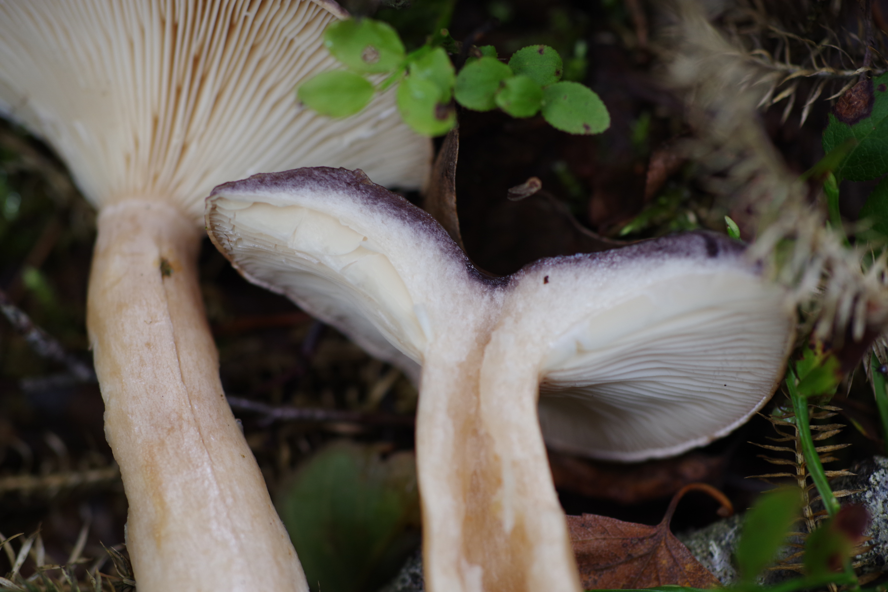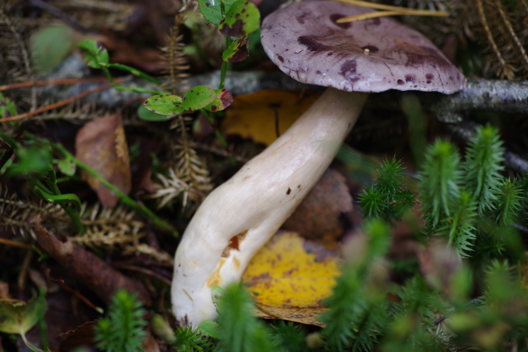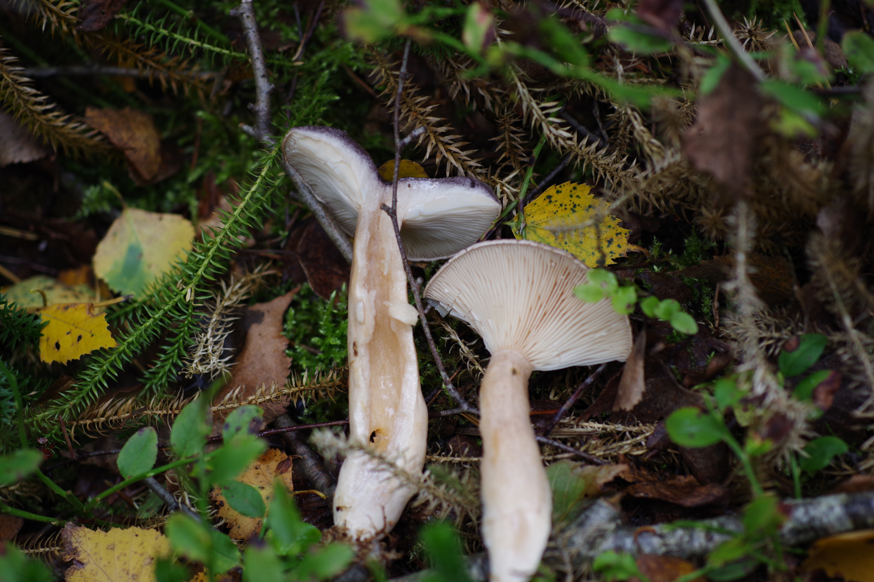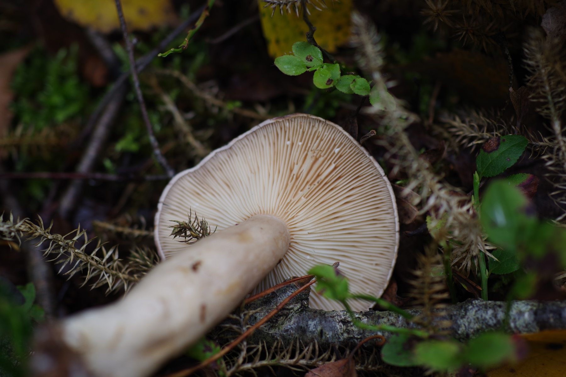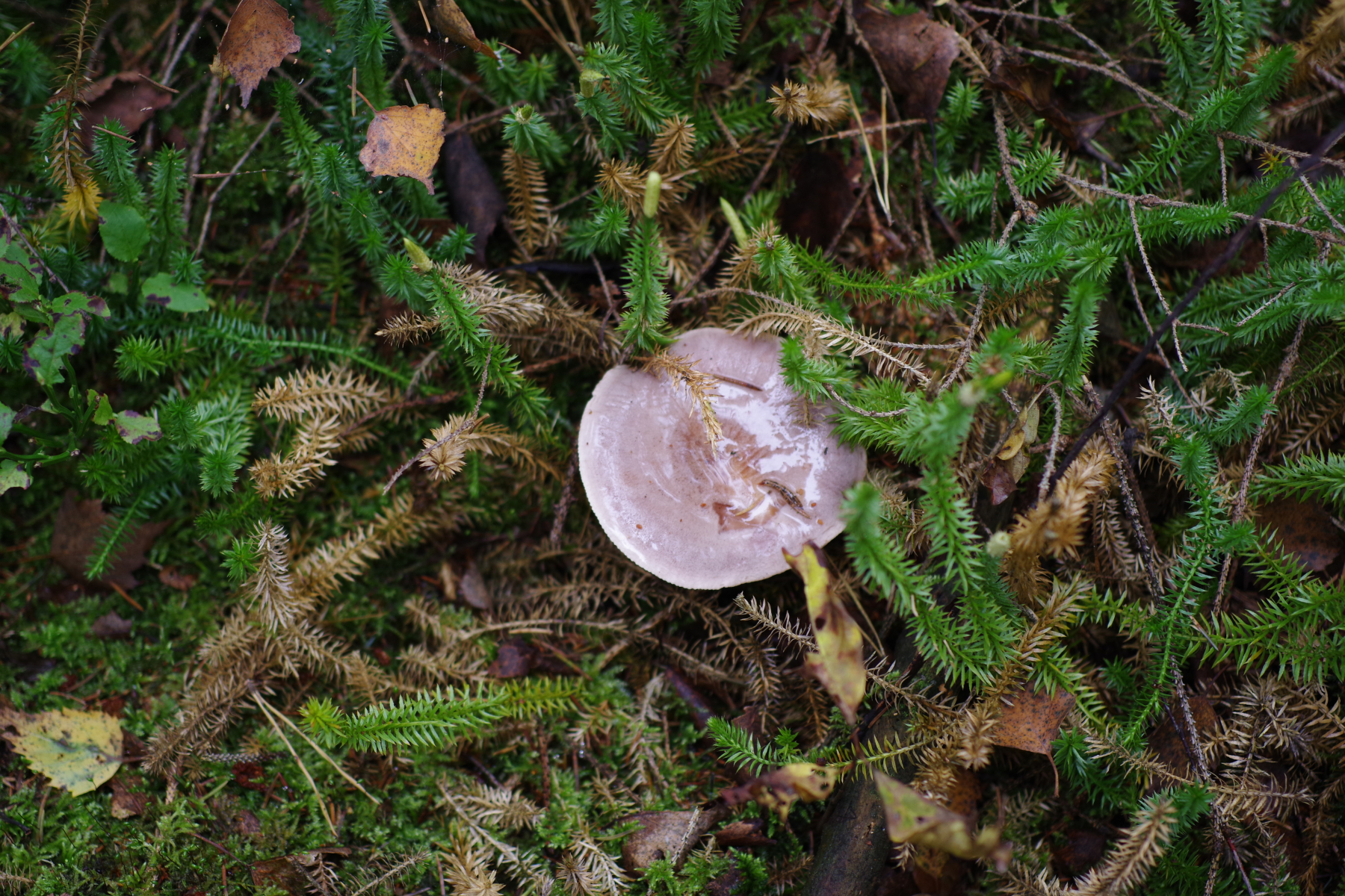 aus dem Moorwald, mit Fichte, Birke und wie man sieht viel Bärlapp, stammt dieser recht große (8-12 cm) Lamellenpilz mit hohlem Stiel. Hut grau, glänzend. Lamellen angewachsen, teilweise verzweigt aber auch mit Zwischenlamellen. Geruch war unauffällig, vielleicht ganz leicht wie Radies. Nicht verkostet. Mein erster Gedanke war ein Milchling, aber mit einem nicht brechenden, sondern fasernden hohlen Stiel kann das ja nicht sein.