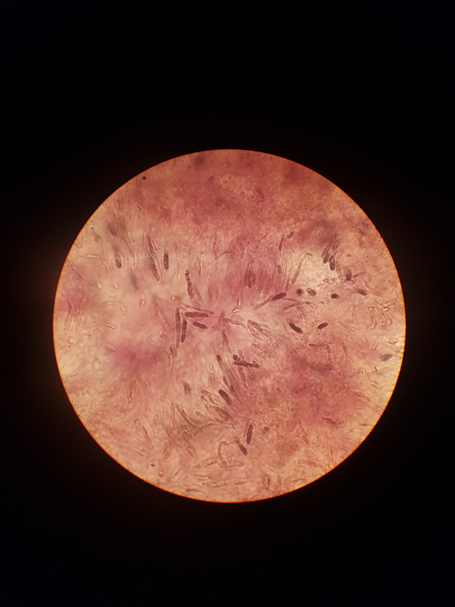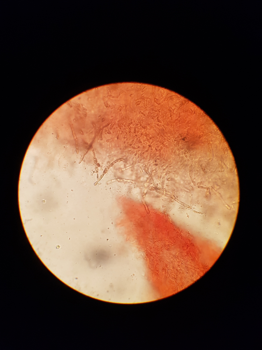 In einem anliegendem und etwas trockenerem, aber nicht trockenem Streifen fanden wir diesen Hallimasch, den ich als A. gallica bestimmt habe. Ich hoffe, dass ich richtig liege. Den will ich mikroskopieren, da die Basidien ja septiert sein sollen.
