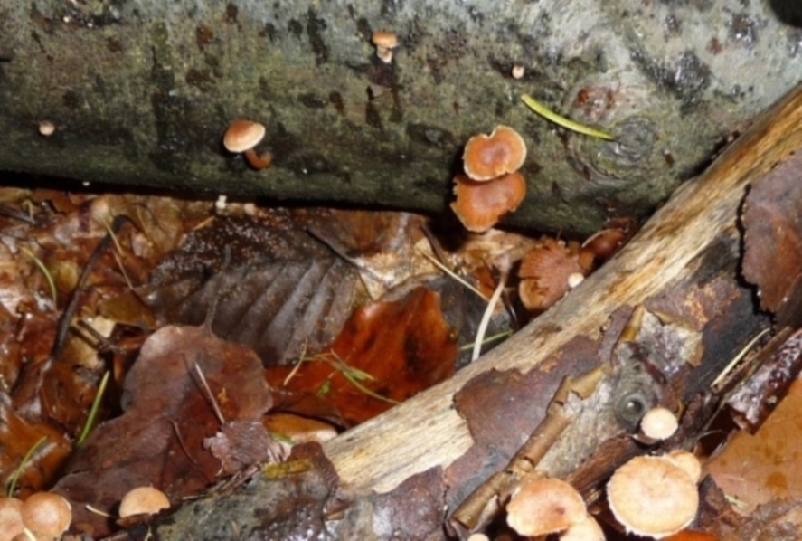 Pilze auf Holz und Blättern