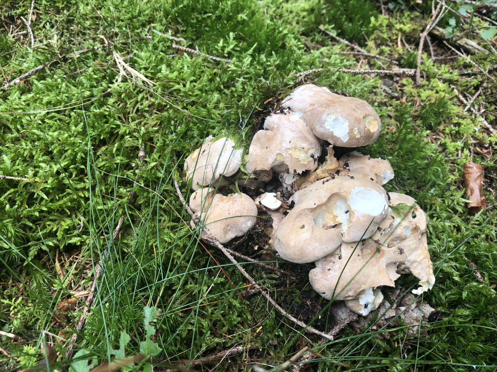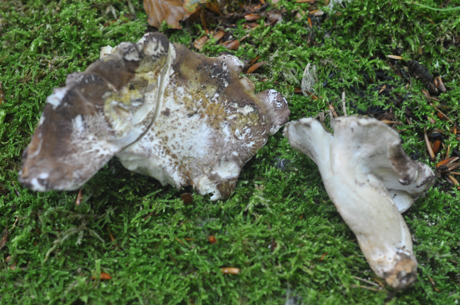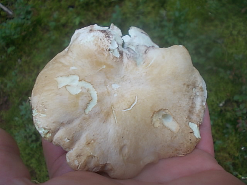 In einem Fichten-Birkenwald auf dem Antarsberget (Vaesternorrland, Schweden) fand ich heute etliche Porlinge, teilweise zu mehreren zusammengewachsen, mit unregelmäßig ausgebeulten Hüten bis 30 cm Durchmesser.