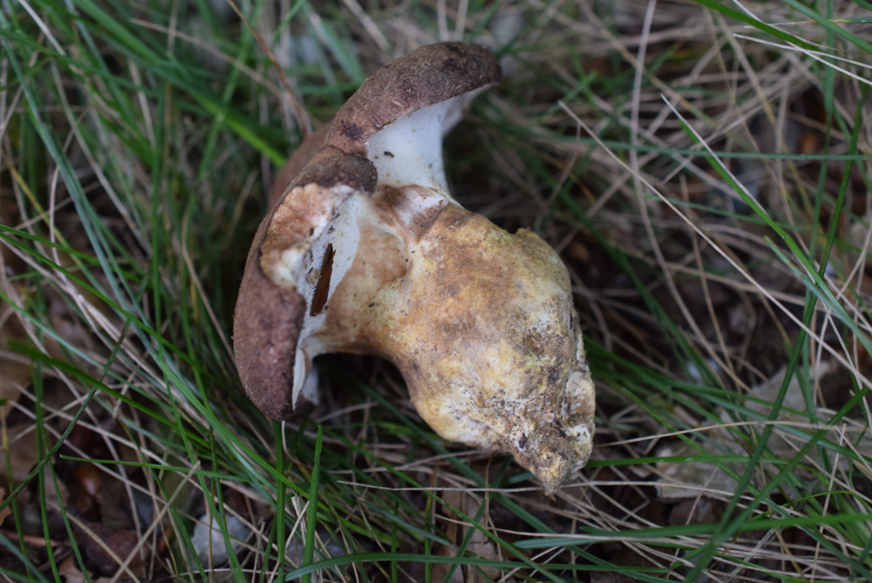 Fruchtkörper mit dicken weißem Stiel, auf dem Boden zwischen Blaubeeren und anderer niedrigen Vegetation.