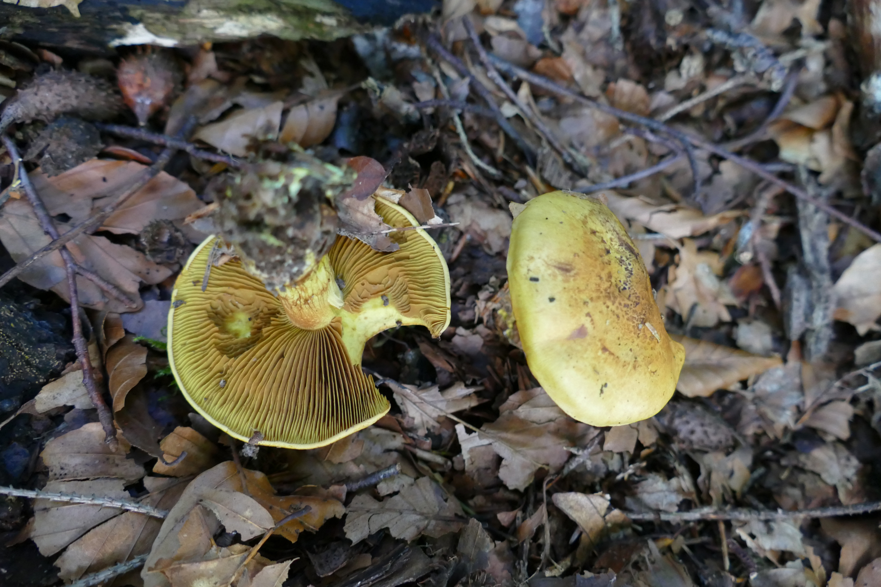 03 Cortinarius flavovirescens im Jungstadium. Hier waren wir etwas zu früh dran, dennoch war ein deutlicher Mehlgeruch und -geschmack sowie die Farben auch wegweisend. Da müssen wir wohl in einer Woche nochmal wiederkommen, um die Fruchtkörper in ihrer vollen Pracht zu bewundern: