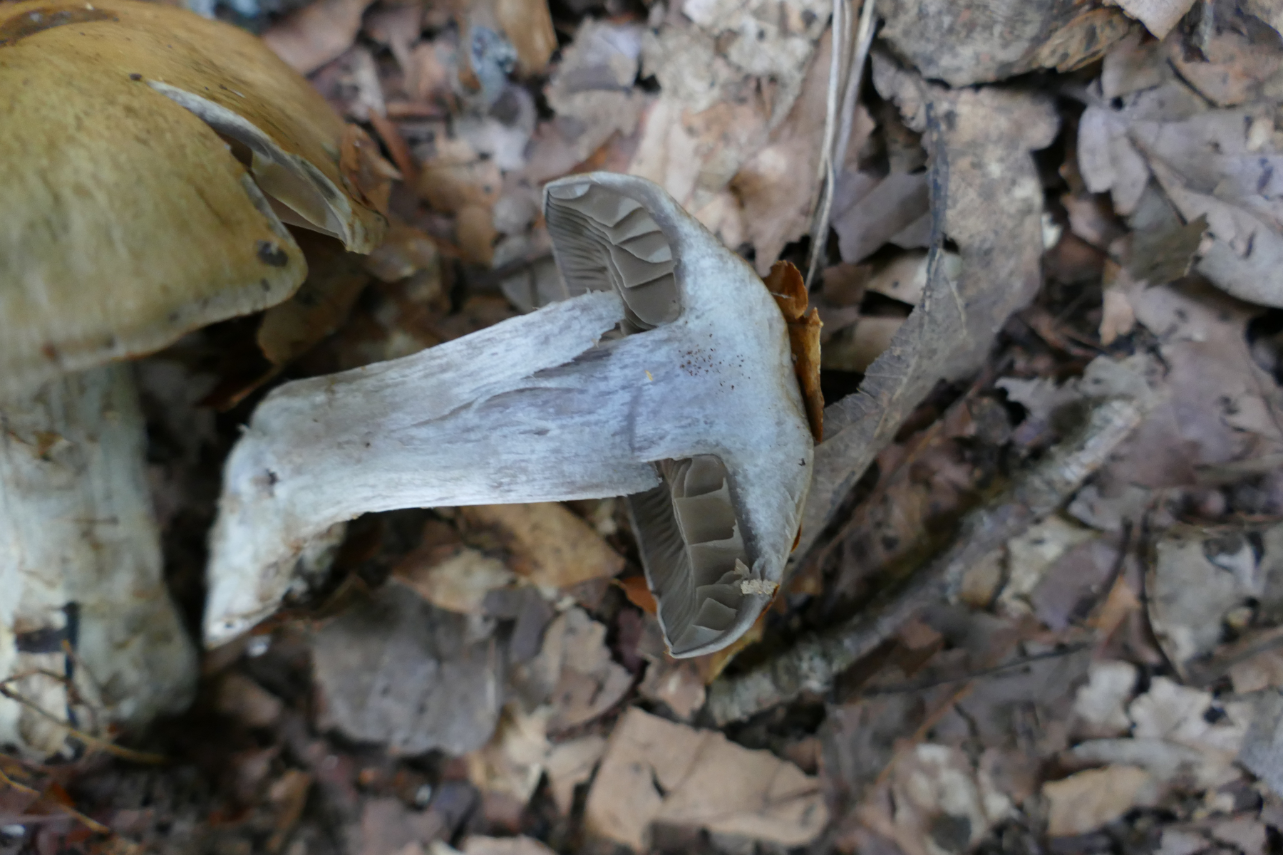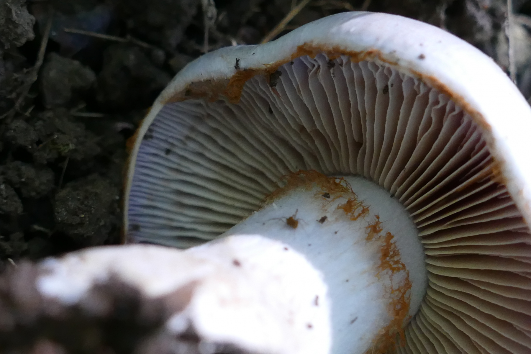 Ansonsten gabs einige Telamonien (5 Arten, die sich gut dokumentieren ließen habe ich eingesteckt, aber schon an der ersten verzweifle ich. Ich habe mit Funga Nordica geschlüsselt und komme trotz sorgfältigem Schlüsseln nicht zum Ziel. Ich lande regelhaft in Telamonien und dort in Key L, komme dann aber entweder zu Cortinarius turgidus, der zwar makroskopisch und von der Ökologie einigermaßen passt, aber weder von den Sporen noch vom "sparse veil". Biege ich vorab im Schlüssel ab, lande ich noch bei Cortinarius alborufescens, der von den Sporen gar nicht passt.