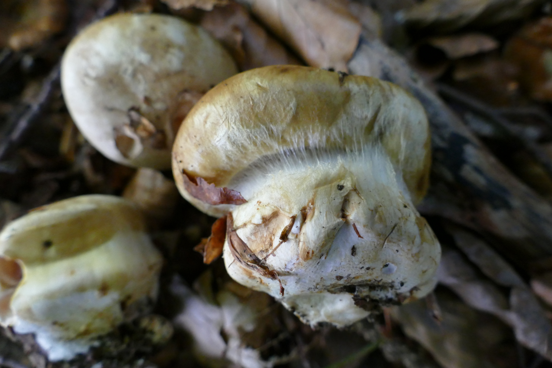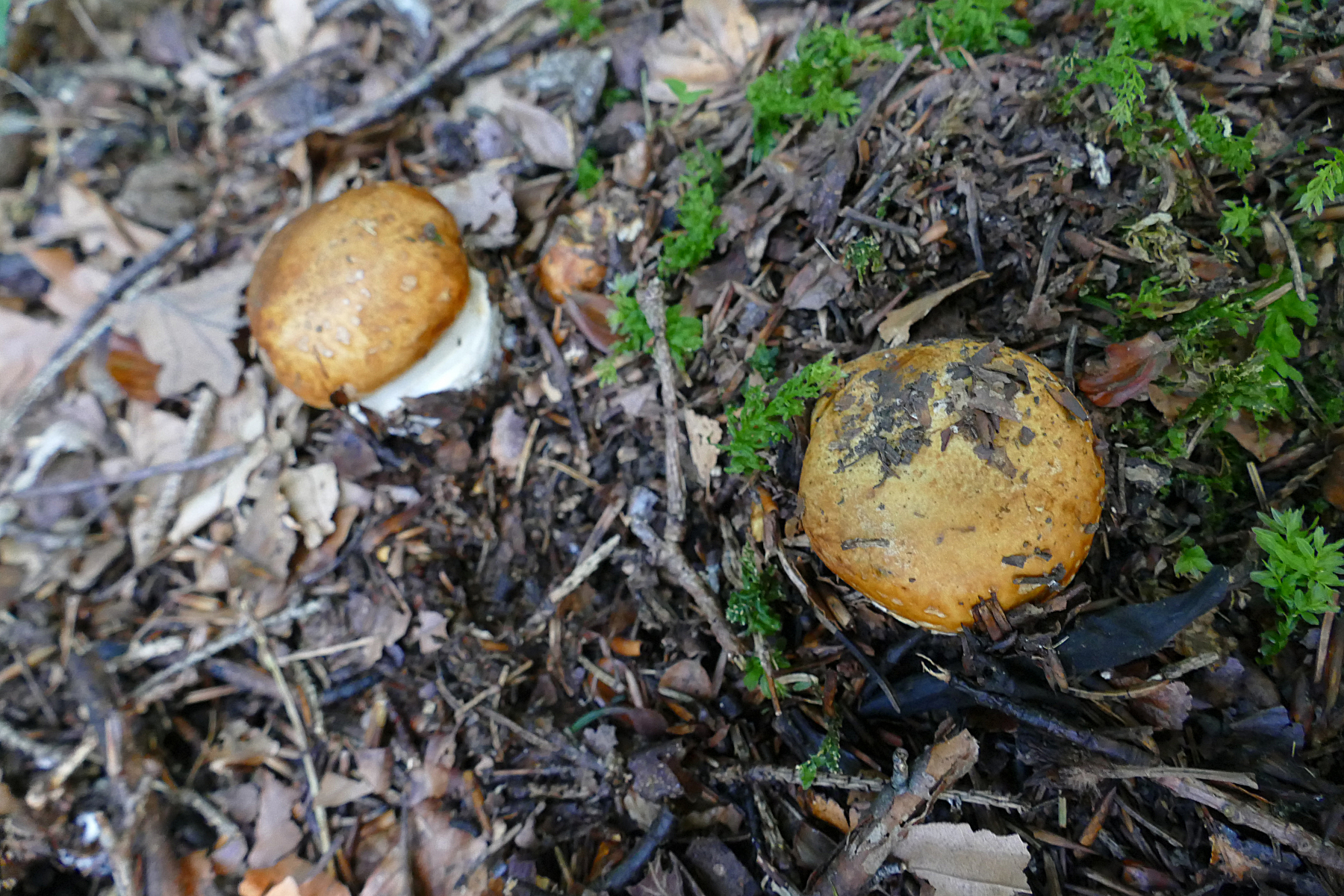 Eigentlich noch nicht in bestimmungsfähigem Zustand, aber sehr wahrscheinlich 05 Cortinarius rapaceotomentosus, da von der Stelle wohl bekannt und Klumpfuss mit braunem Hut. Auch da müssen wir wohl in einer Woche nochmal wiederkommen.