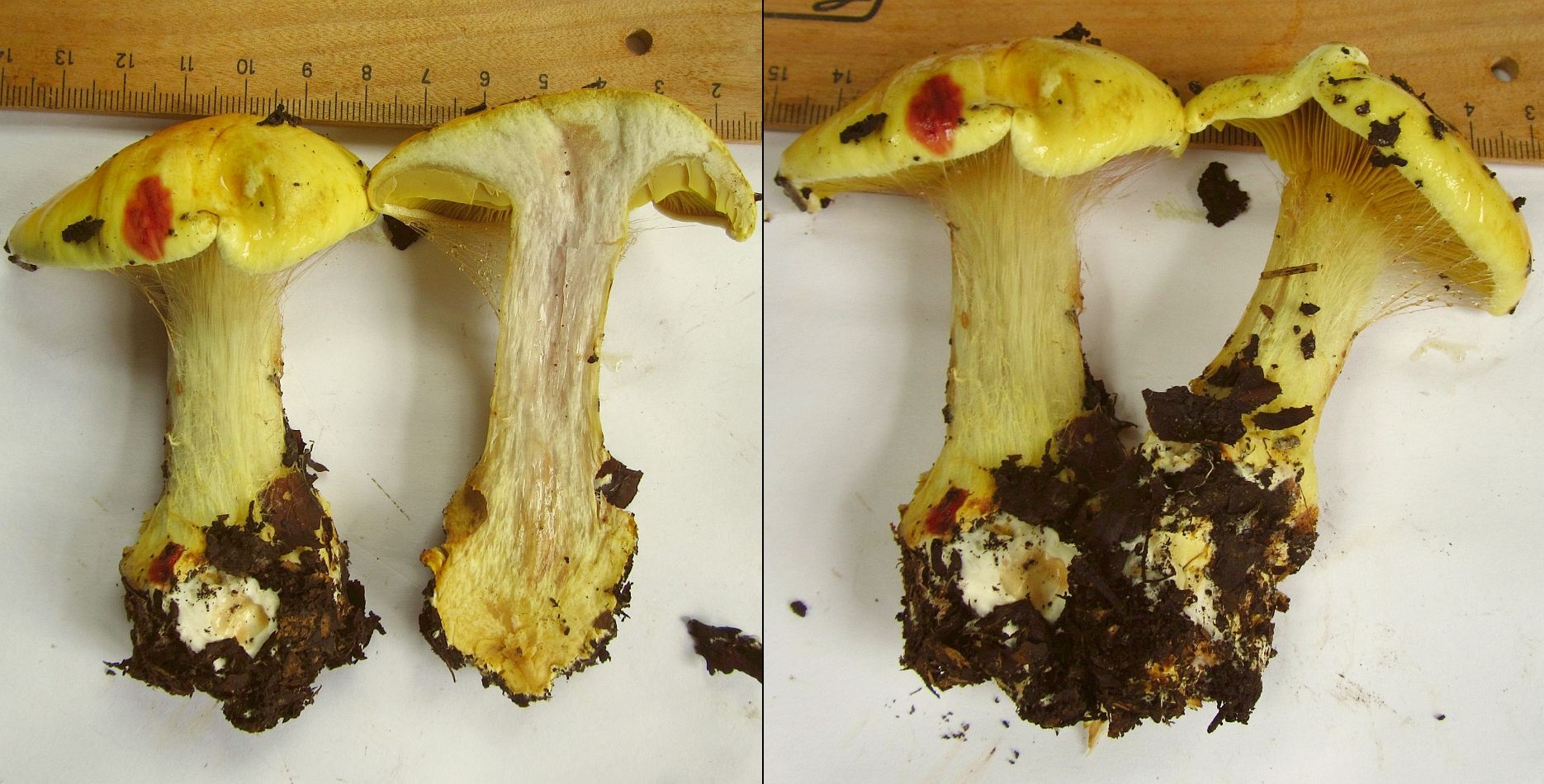 Fruchtkörper fleischig, hell, weiß mit zarter hellbräunlicher Note (siehe Bilder). Auffällig das Universalvelum mit ausgeprägtem Gürtel (an torvus erinnernd) und gut sichtbarer Bänderung. Lamellen einen hellbraunen, fast schon leicht oranglichen Ton, breit, eher etwas auseinander. Velum weiß bei ganz jungen Fruchtkörpern.