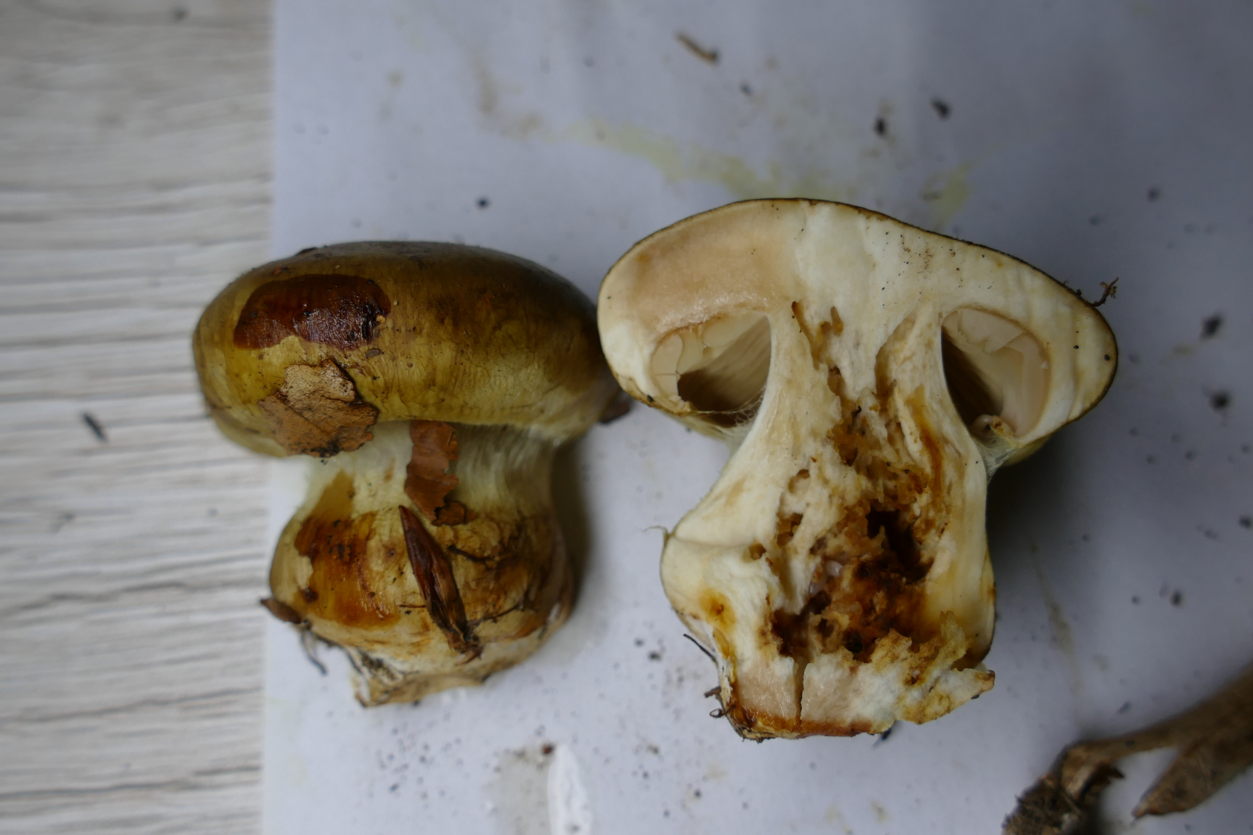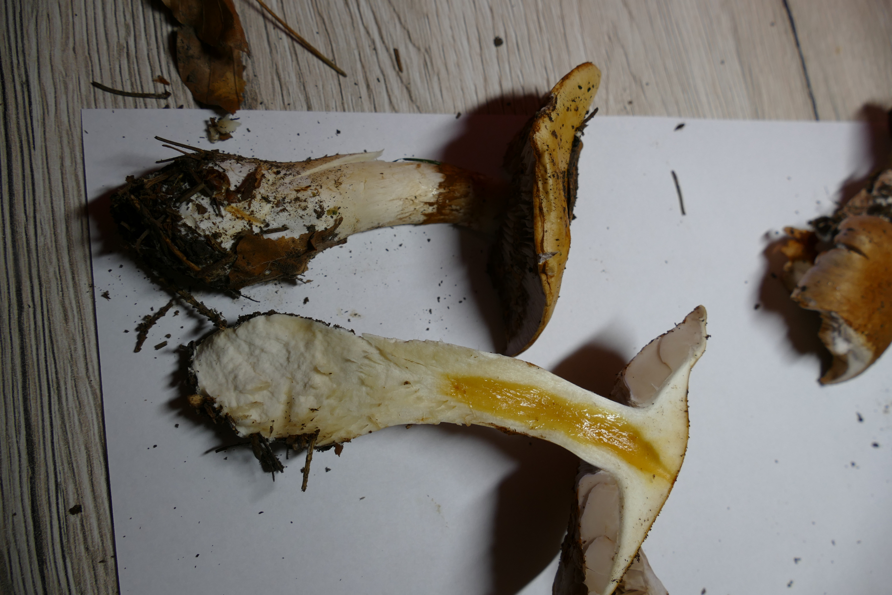 Hier habe ich wohl zu flott einen Haken dran gemacht. Leider waren das einzelne, schon fortgeschrittene Fruchtkörper. Junge Fruchtkörper waren nicht mehr zu sehen. Das Fleisch war schon durchgehend gelb. Habe den uralten Fruchtkörper nochmal aufgeschnitten, aber der ist schon gut mitgenommen. Man kann aber noch erahnen, dass das Fleisch eher nicht hell war .... hier nochmal unter Weißlicht: