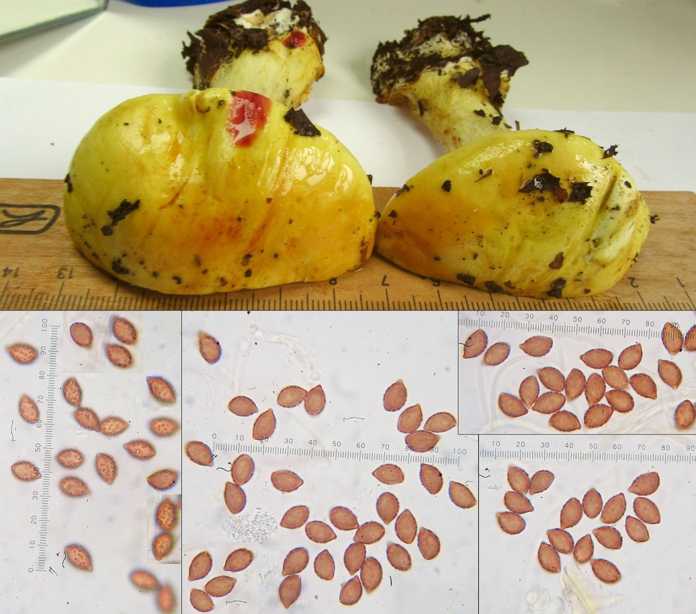 in der Gruppe (Lamellen gelb + nie mit Blauton, KOH auf Hut und Stielbasis rot, Trama nicht oder nur in Stielbasis und Hutfleisch gelb) gibt es noch ein paar mehr Arten wie zB Cortinarius alcalinophilus und Cortinarius cedretorum, bei ein paar Arten (bergeronii, cedretorum, selten elegantissimus) hat man bei ganz jungen fruchtkörpern bläuliches Fleisch in der Stielspitze, teils im Hut und manchmal auch außen am Stiel, ohne ganz junge Fruchtkörper und ohne Sporengrößen wird's schwierig in der Gruppe.