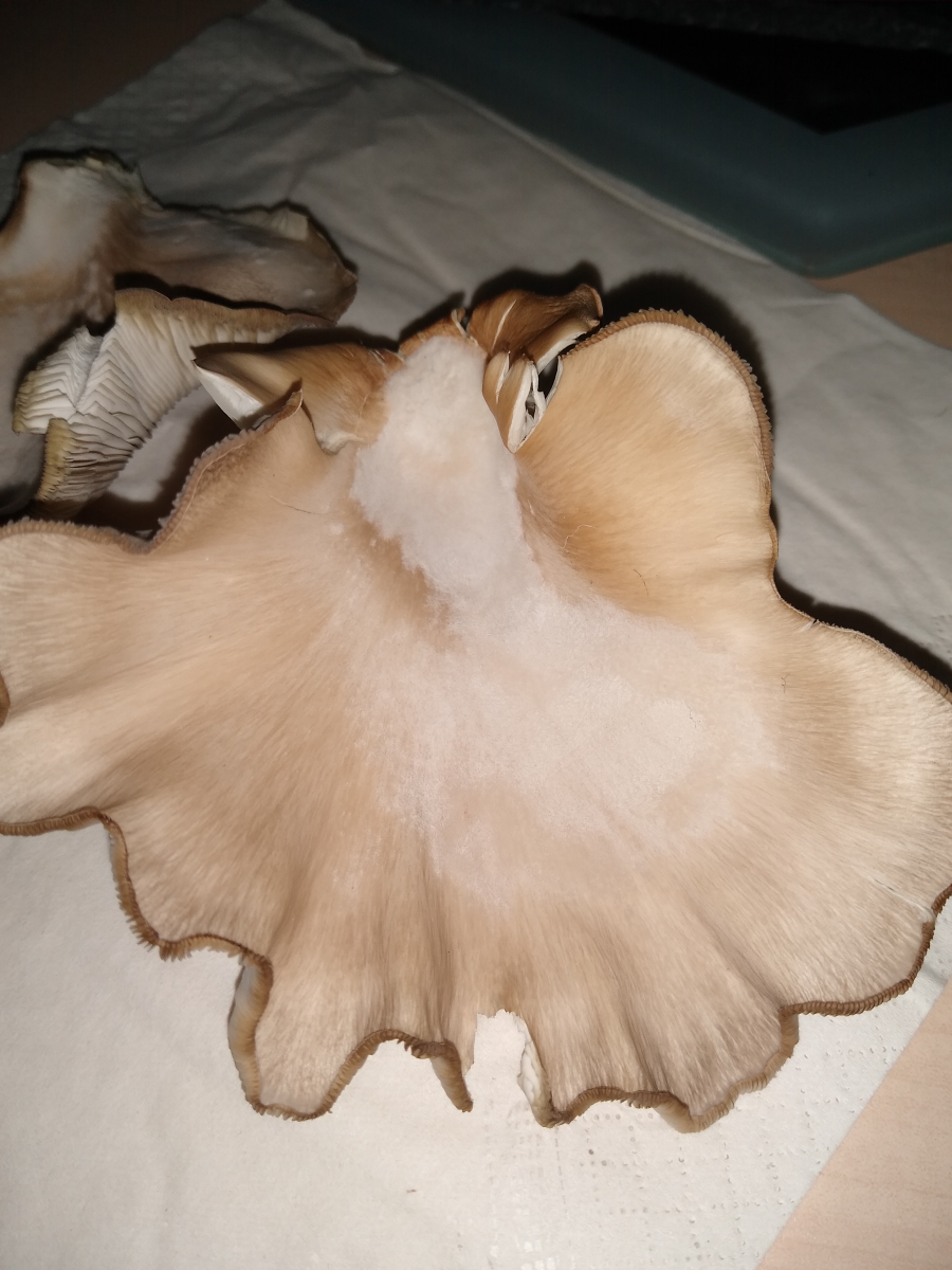 Da ich neu hier bin, erkläre ich kurz meine Ausgangssituation:Ich habe heuer mit dem Pilzzüchten begonnen und gestartet mit 0,5kg gekaufte Austernseitlinge Körnerbrut. Habe das Myzel immer weiter mit Kaffeesatz gezüchtet und bin nun schon auf ca 25kg Myzel. Züchte unhygienisch und hatte schon 4 mal einen kleinen Schimmelansatz wobei 2 mal der Schimmel vom Myzel gefressen wurde und 2x ich etwas mit wegschaben aushalf.Hatte nun schon 4x eine Ernte wobei ich die letzte zur Sicherheit entsorgte aufgrund Schimmelverdacht.Auf der Pilzoberseite hat sich ein weicher weißer Pelz gebildet, habe davon im Anhang Bilder.Was ist eure Meinung, Schimmel oder Pilz?