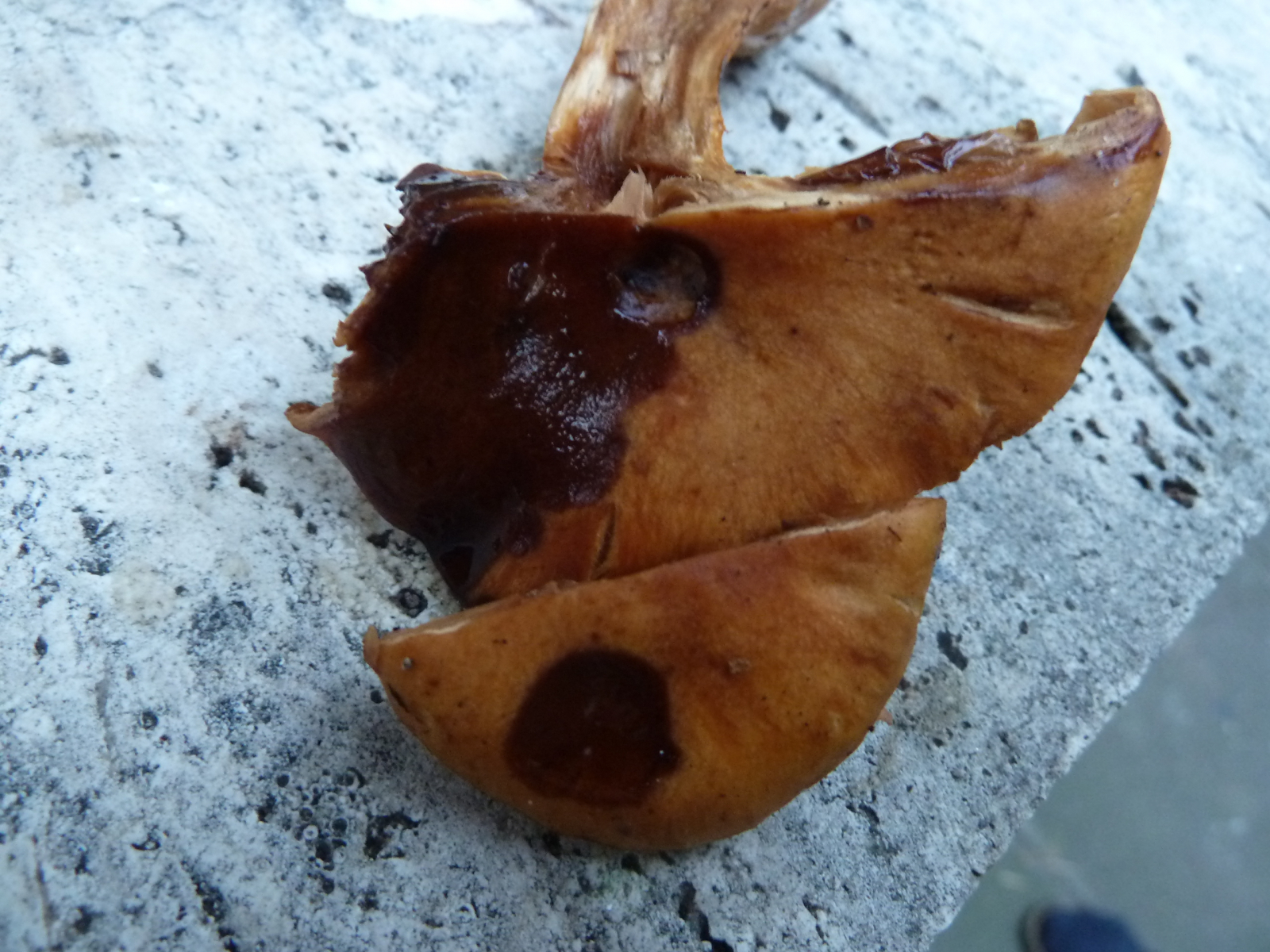 Auffällig sind hier die orangebraunen Stellen an der unteren Stielhälfte auch bei ganz jungen Exemplaren (vermutlich kein Sporenpulver ? Siehe die beiden waagerecht liegenden Fruchtkörper) und die dunkel rostbraune Farbreaktion mit Natronlauge auf der Huthaut und in den Lamellen, im Fleisch schwach und auf dem Stiel praktisch nicht:
