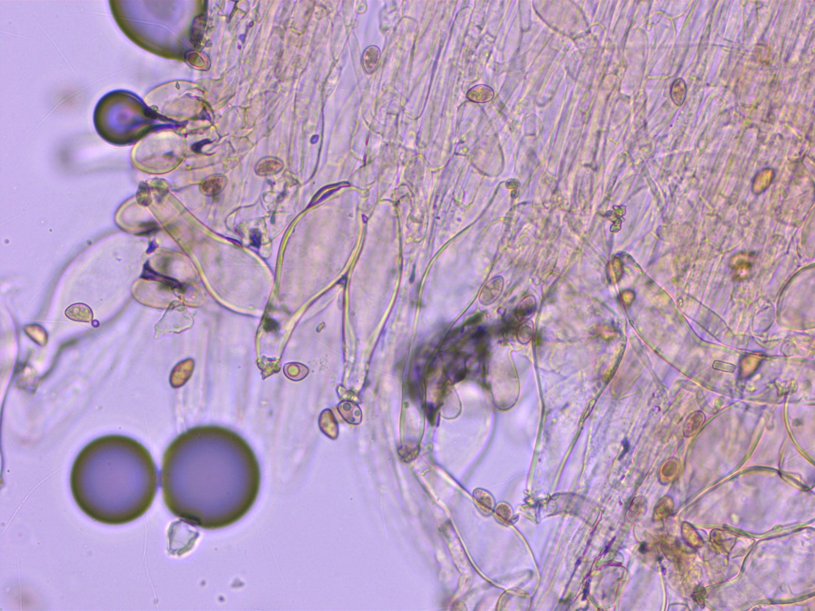 Cheilozystiden mit eher dünnen Wänden, in KOH deutlich gelb, mit vielen Kristallen.