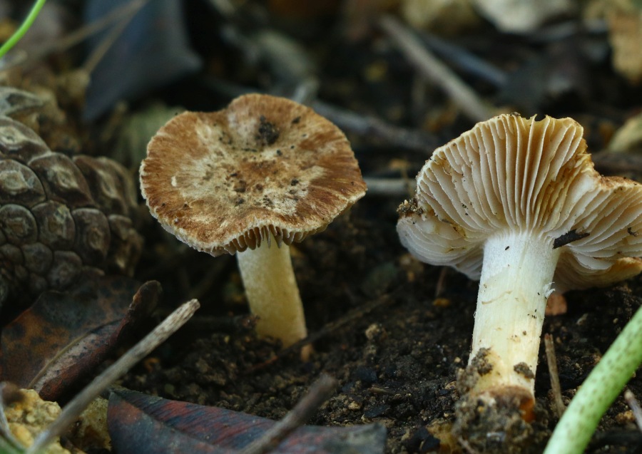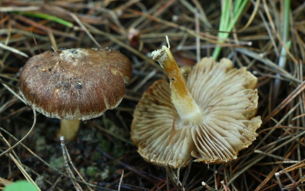 I am working on the ID of an Inocybe with cracking and small (2-3 cm across) pileus with chestnut color and variable striated with beige bands or patches (maybe because of hard soil over) growing at edges or under of a pine afforested area.