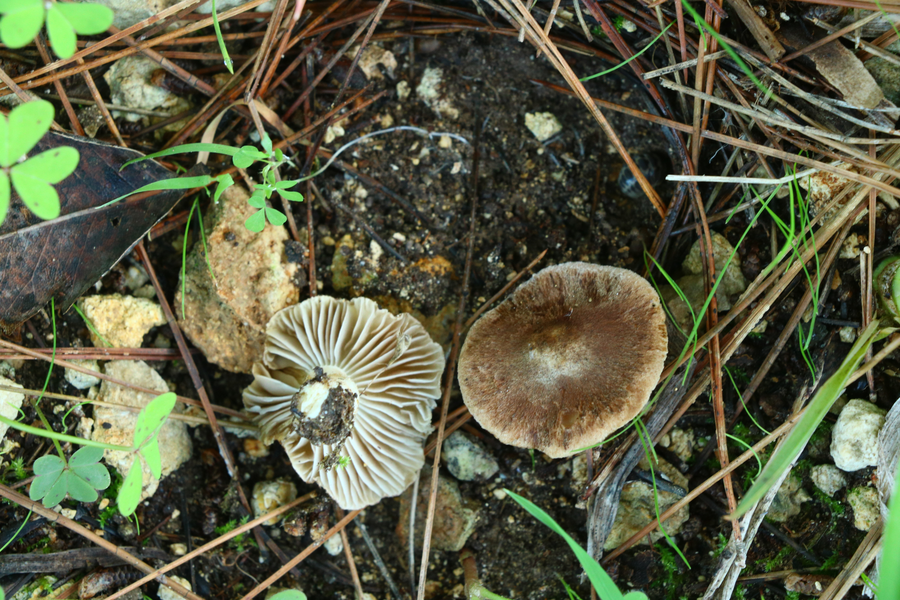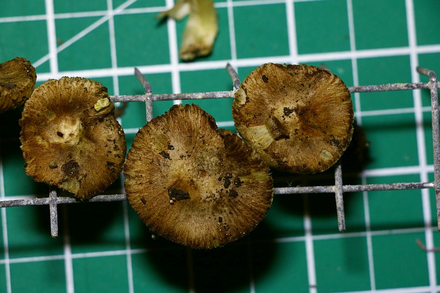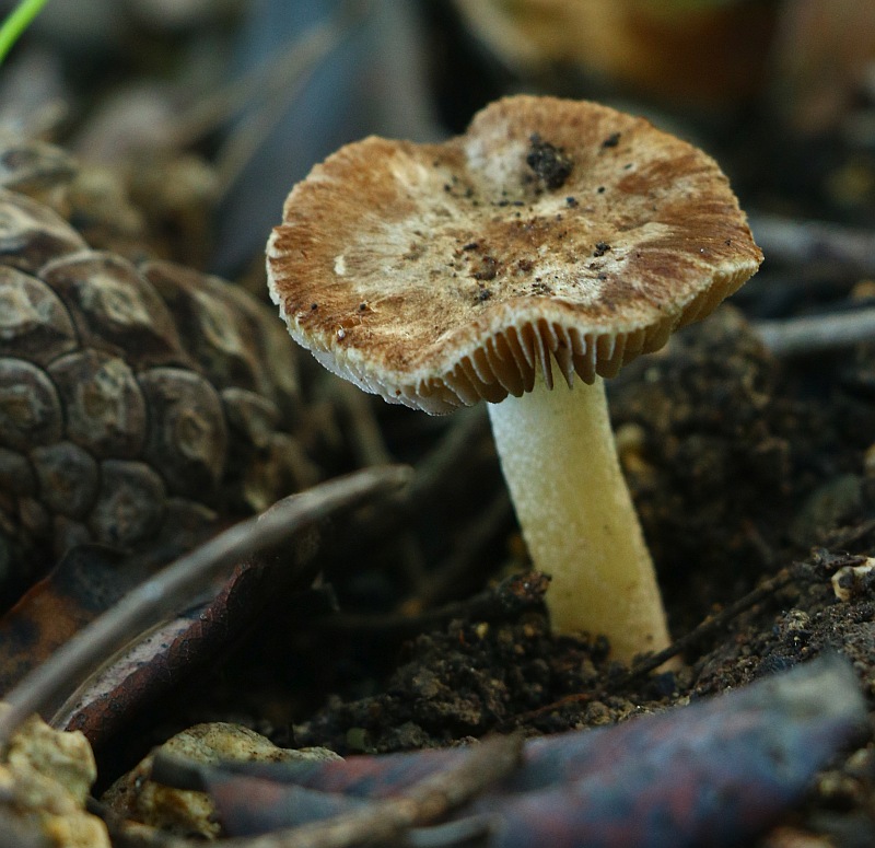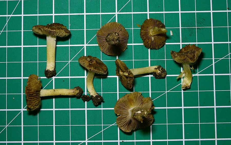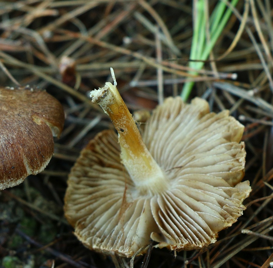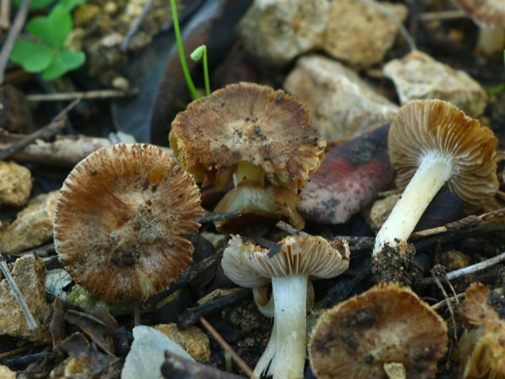 I am working on the ID of an Inocybe with cracking and small (2-3 cm across) pileus with chestnut color and variable striated with beige bands or patches (maybe because of hard soil over) growing at edges or under of a pine afforested area.