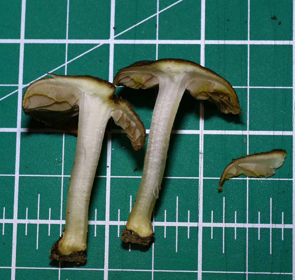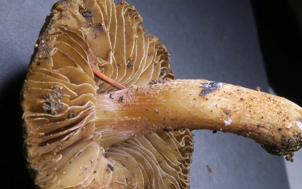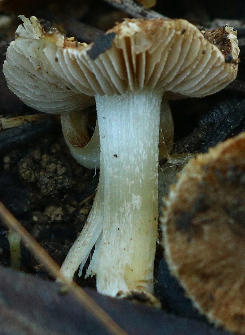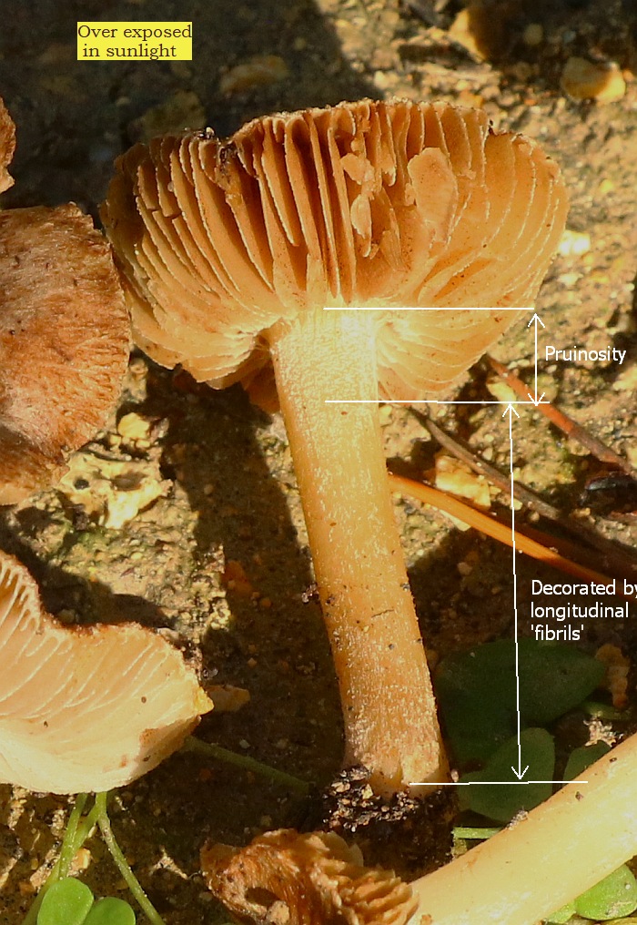 The stipe seems to redden a bit in old specimens otherwise ocher-cream when fresh and undisturbed. The pruinosity seems to run half the stipe length (differs between various specimens) in some it seems going down in a patchy distribution below the lower half of the stipe.