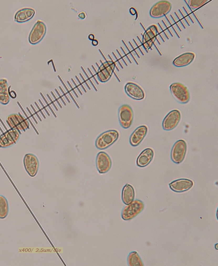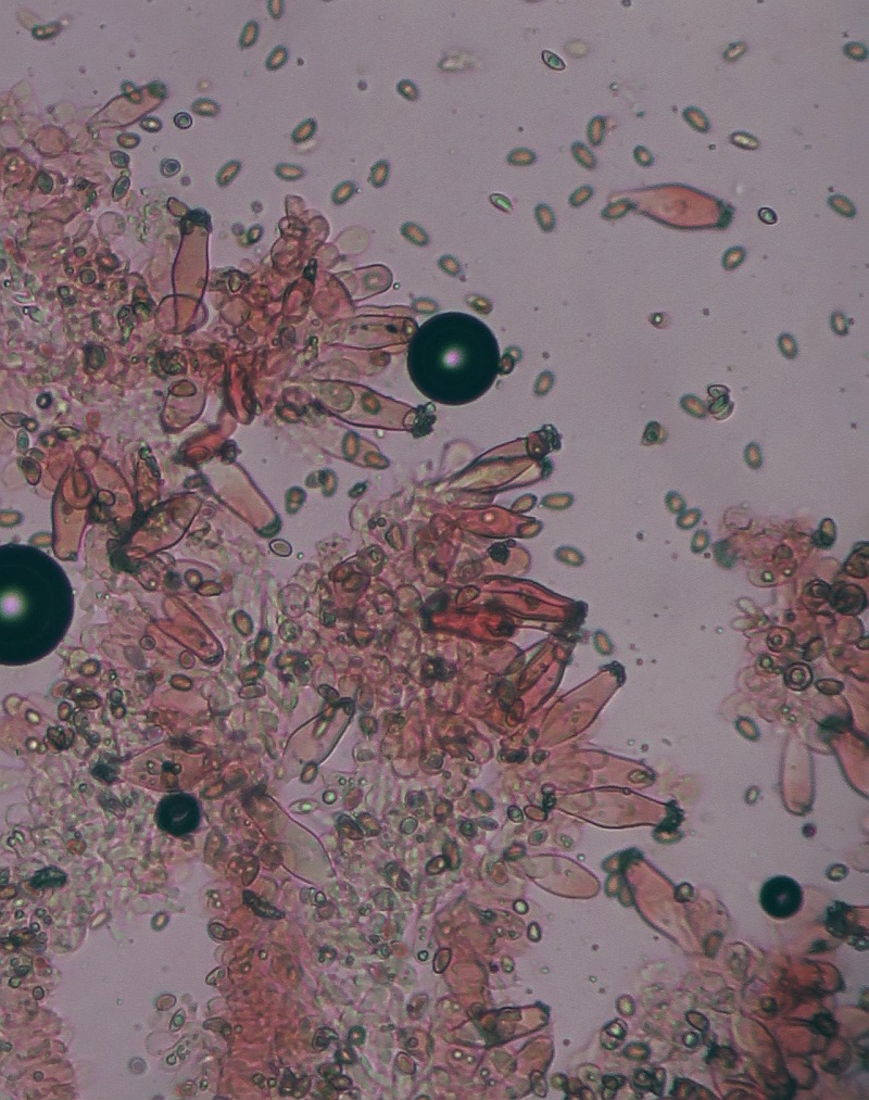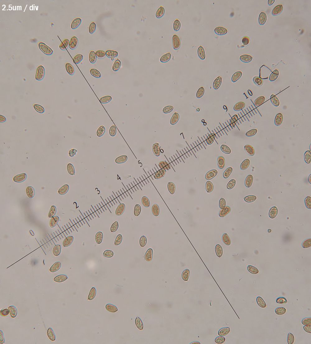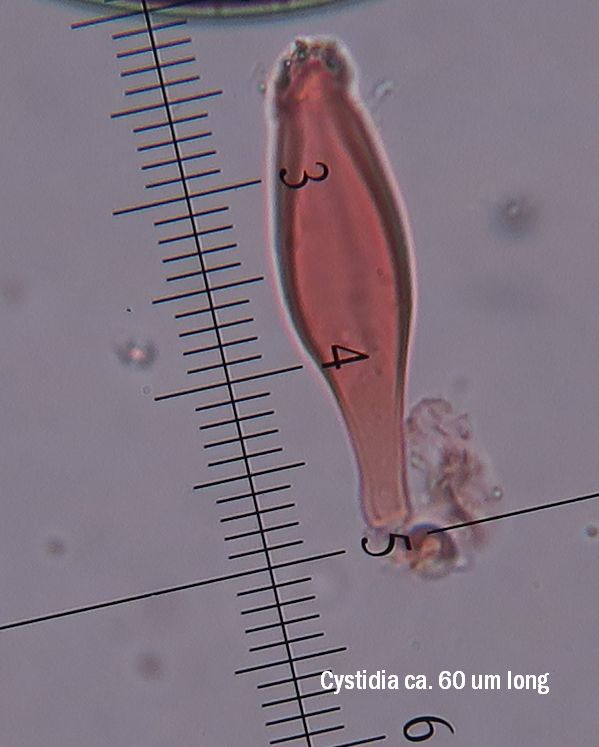 My options are short listed on fuscidula / nitidiuscula / leiocephala. The spores are broadly ellipsoid navicular (front view), almond-shaped (dorsal view), 10.6-13.2 um x 5.2-7.6 um (mean12.1 x 6.6) with a Q of 1.8 +/- 0.3. The cheilocystidia have a thick wall (not extremely thick) with apical crystals, in clusters 60-70 x 13.5-18um, while the pleurocystidia are more or less similar but not frequent and usually solitary.