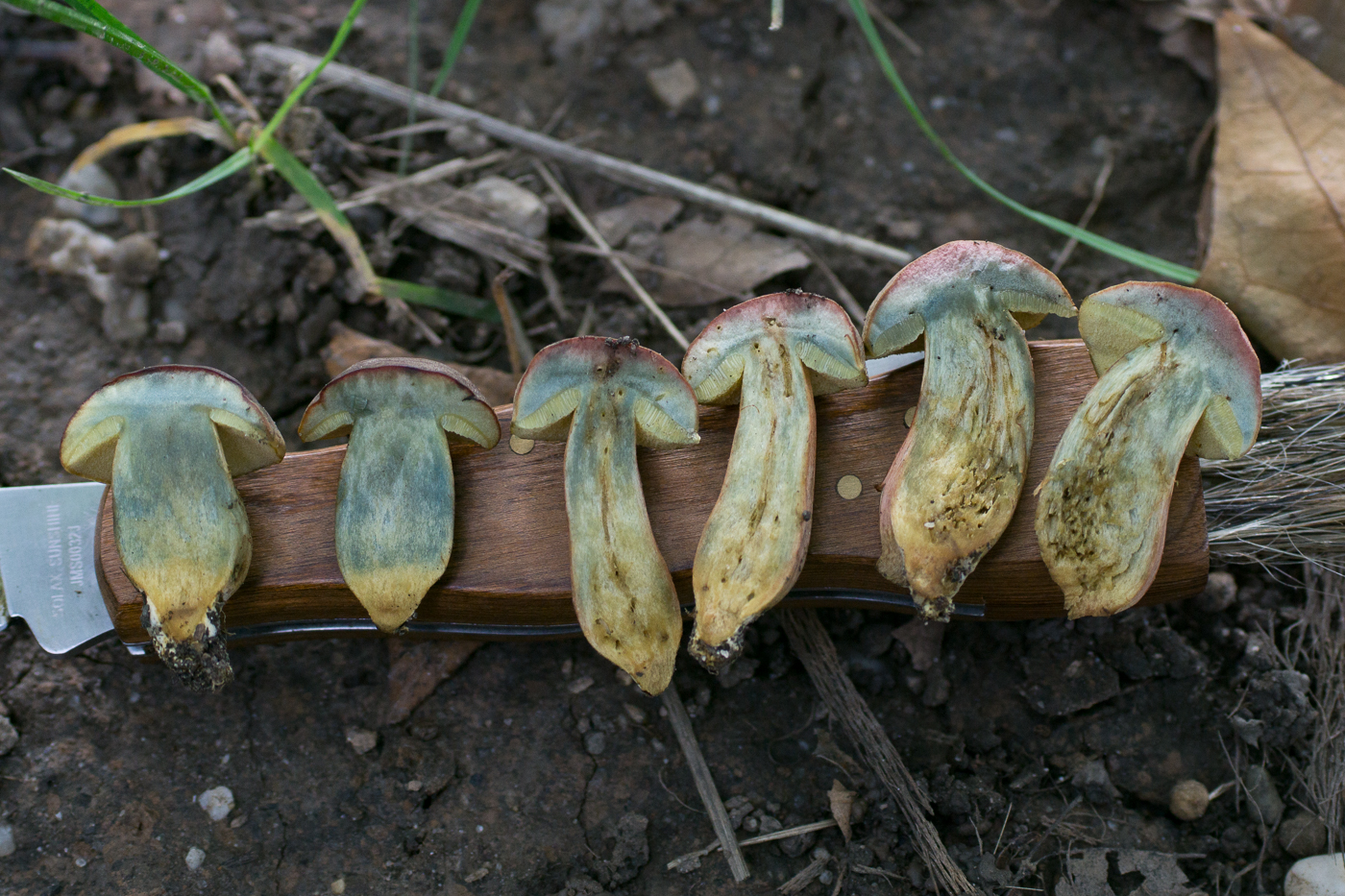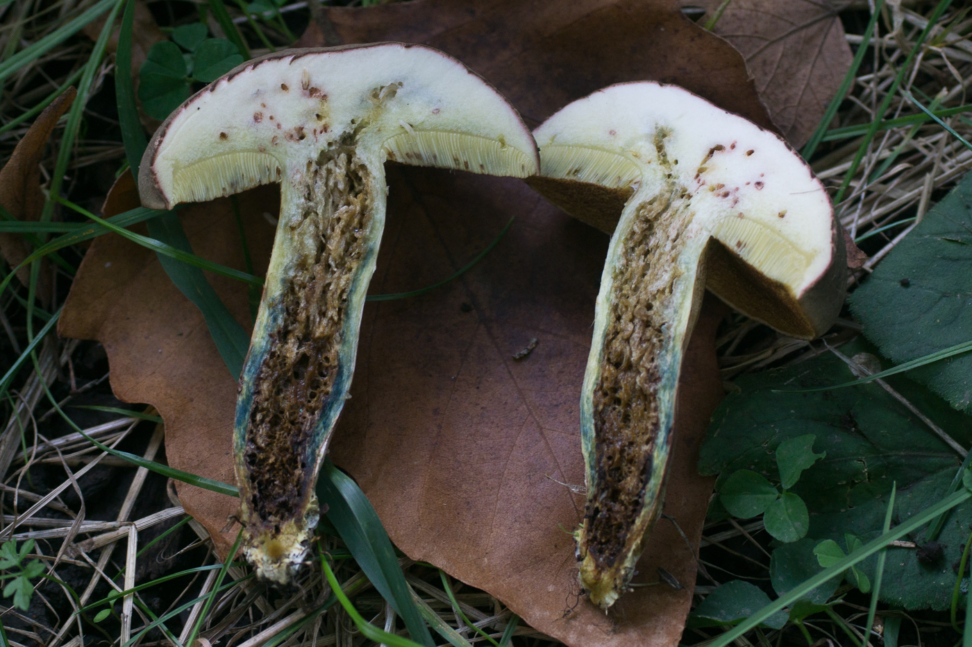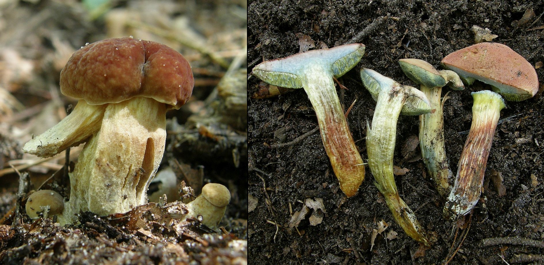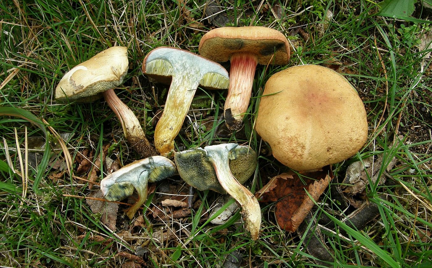 Mit dem schönen roten Hutfleisch (hatte ich auch noch nicht so stark ausgeprägt) und ordentlichem Blauen sind die beiden hellhütigen recht eindeutig Hortiboletus bubalinus. Der linke spart sich hingegegen das Röten im Hut, aber blaut auch recht ordentlich rundherum. Ich Vermute daher, dass das wohl auch H. bubalinus sein wird. Die Alternative wäre H. engelii, der aber üblicherweise langsamer und schwächer im Fleisch blaut und auch außen und an den Poren zurückhaltender mit den blauen Farben ist.