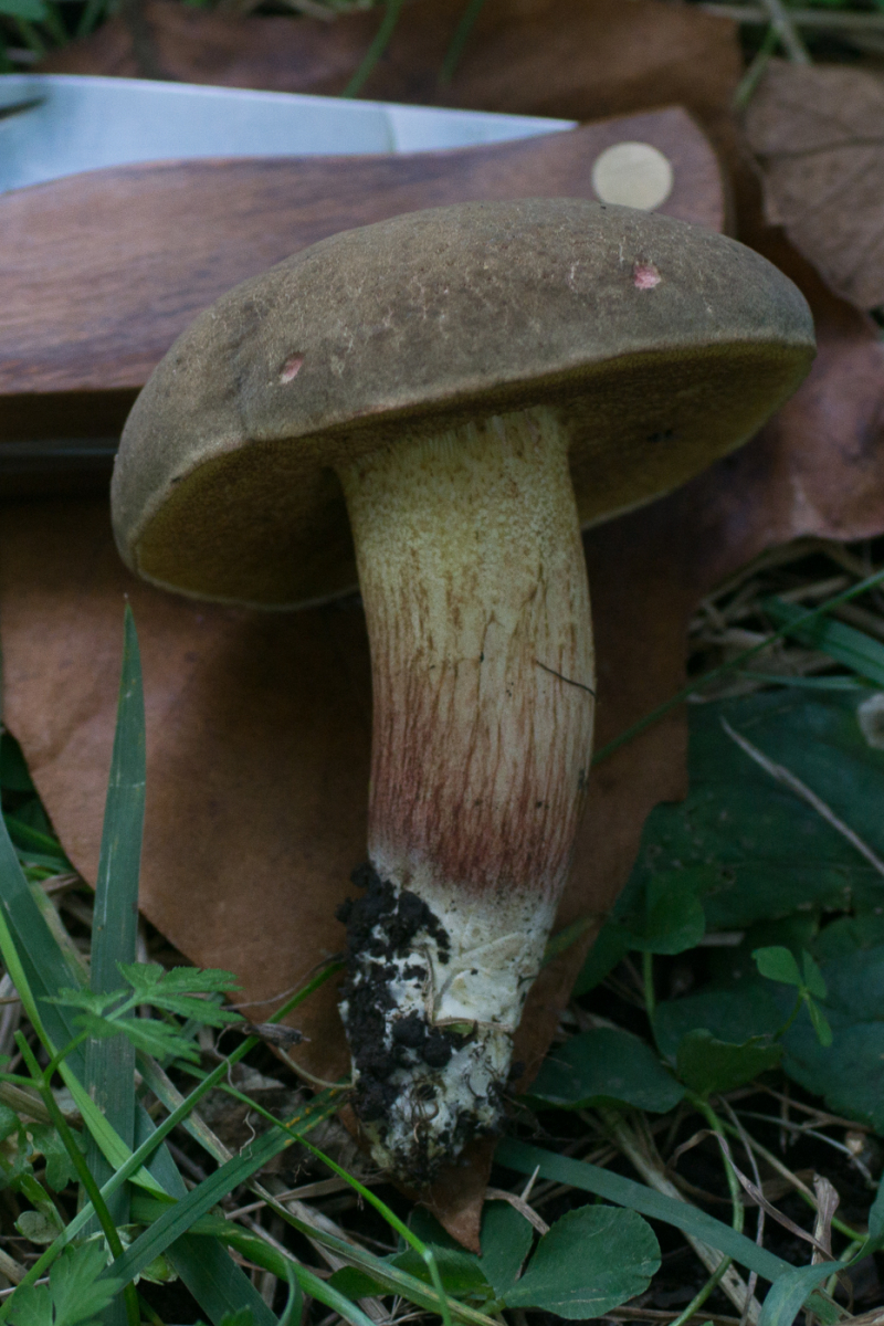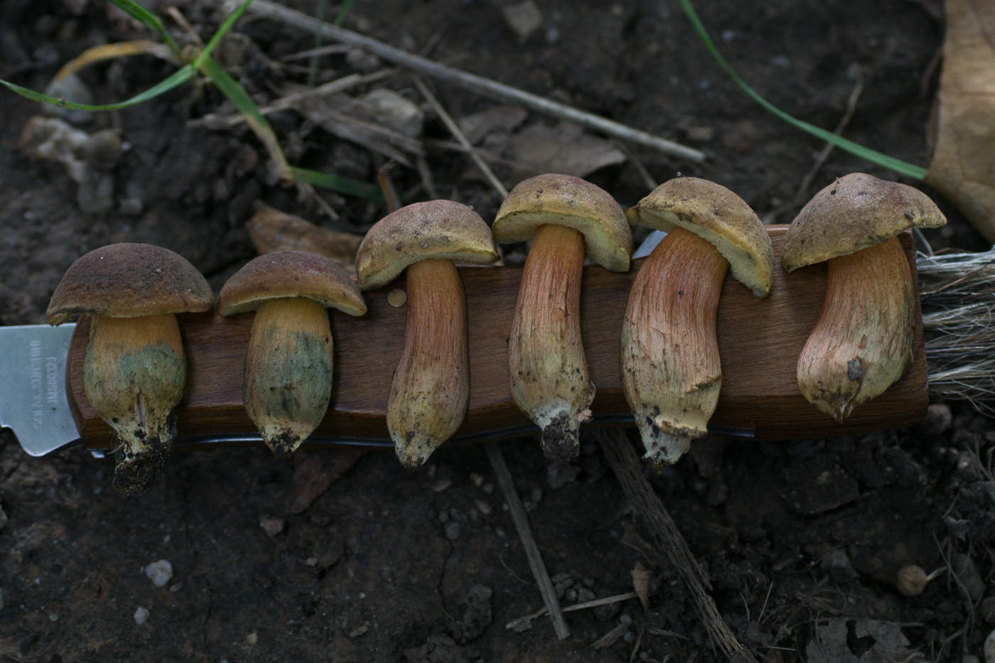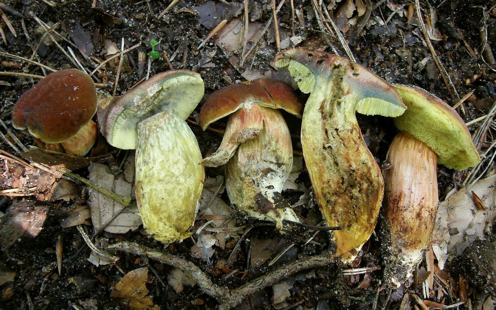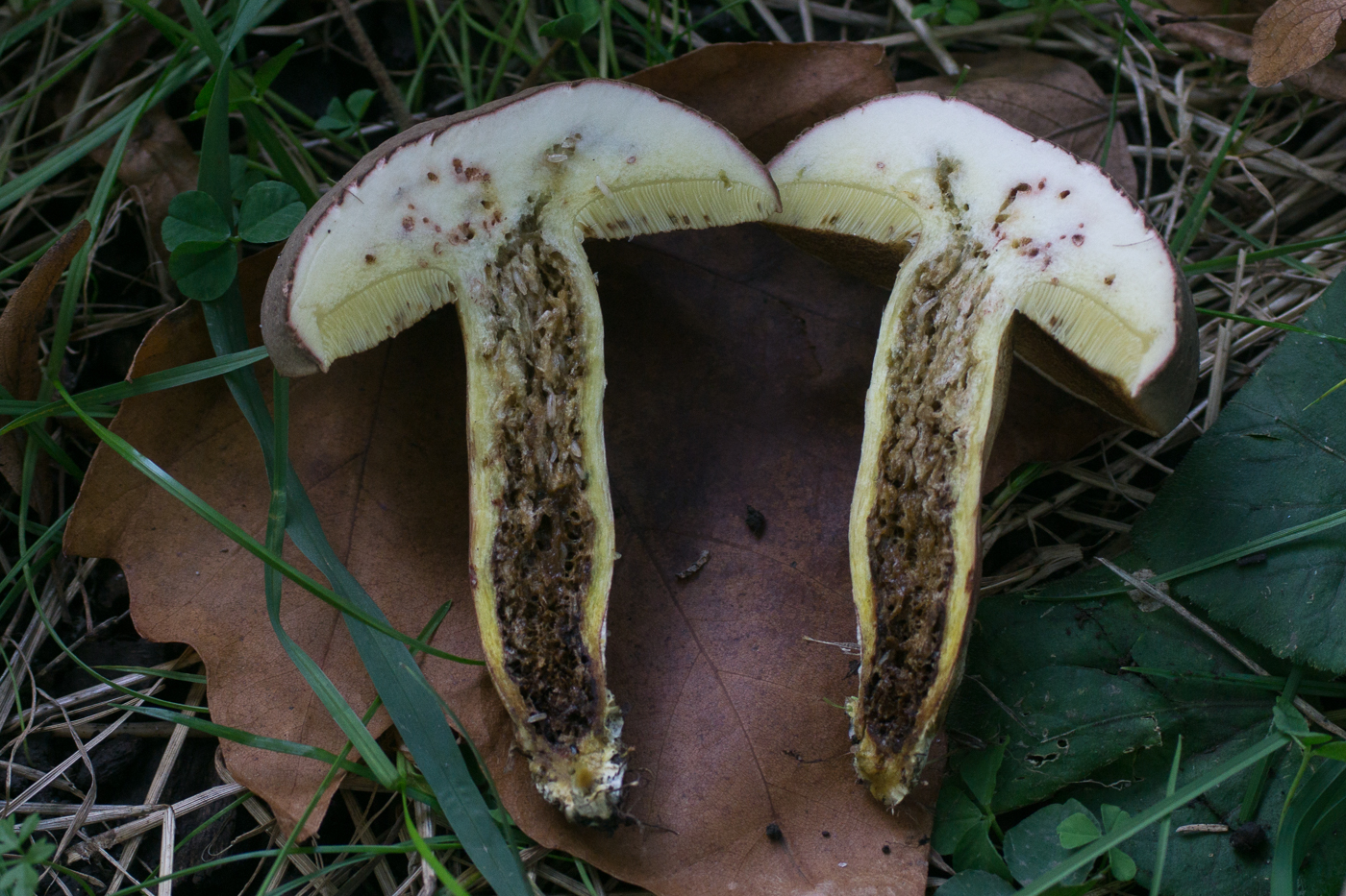 Mit dem schönen roten Hutfleisch (hatte ich auch noch nicht so stark ausgeprägt) und ordentlichem Blauen sind die beiden hellhütigen recht eindeutig Hortiboletus bubalinus. Der linke spart sich hingegegen das Röten im Hut, aber blaut auch recht ordentlich rundherum. Ich Vermute daher, dass das wohl auch H. bubalinus sein wird. Die Alternative wäre H. engelii, der aber üblicherweise langsamer und schwächer im Fleisch blaut und auch außen und an den Poren zurückhaltender mit den blauen Farben ist.