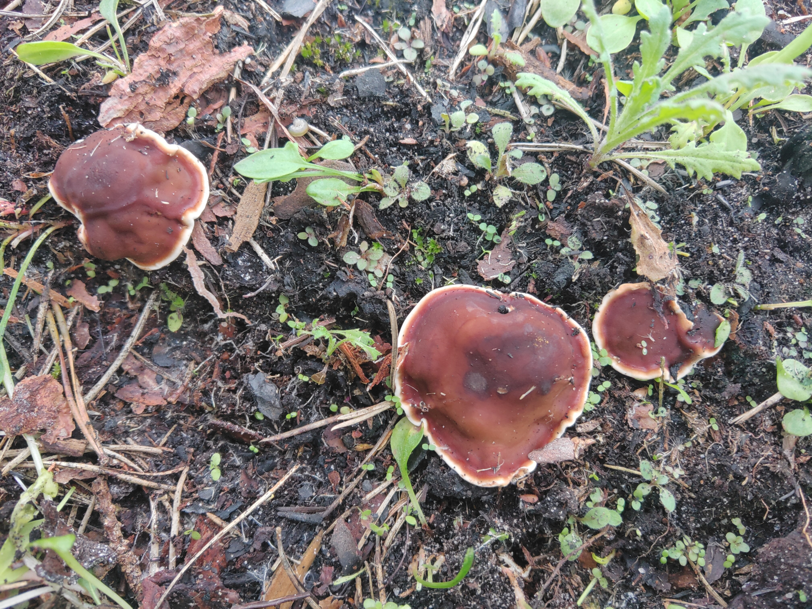 Carina erspähte einen kleinen roten Becherling auf Erde, den ich aufgrund von kaum wahrnehmbarer Behaarung für beachtenswert hielt. Mikroskopisch kam ich dann auf Melastiza flavorubens: