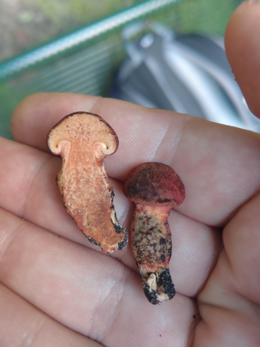 Wie sagte unser Öhrling so schön? Ein Stacheling kommt selten allein! Und tatsächlich konnten wir an diesem Hang eine (oder zwei??) weitere Arten finden, bei denen wir bestimmungstechnisch immerhin mal in der Gattung Hydnellum landen. Dann hören die Fähigkeiten leider auch schon auf, weshalb wir über Hilfe sehr dankbar wären! Leider sind die Fruchtkörper sehr klein, weshalb ich von Geschmacksproben zunächst Abstand genommen habe
