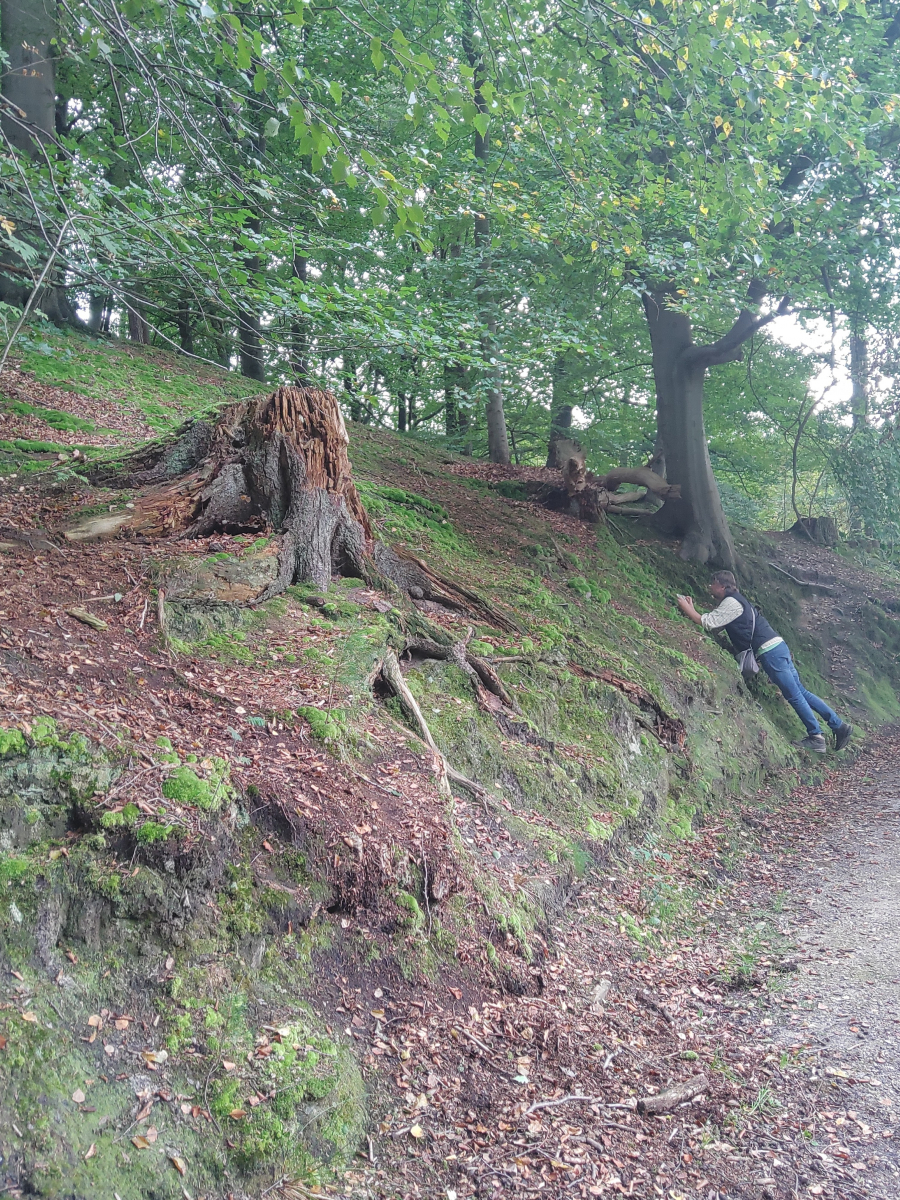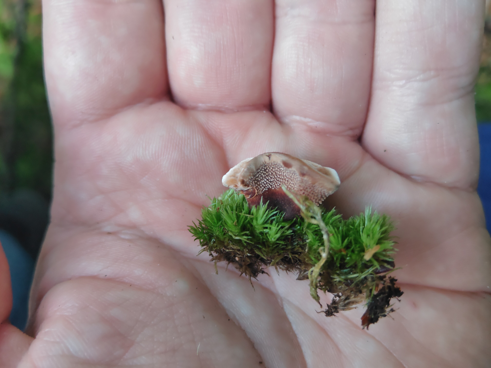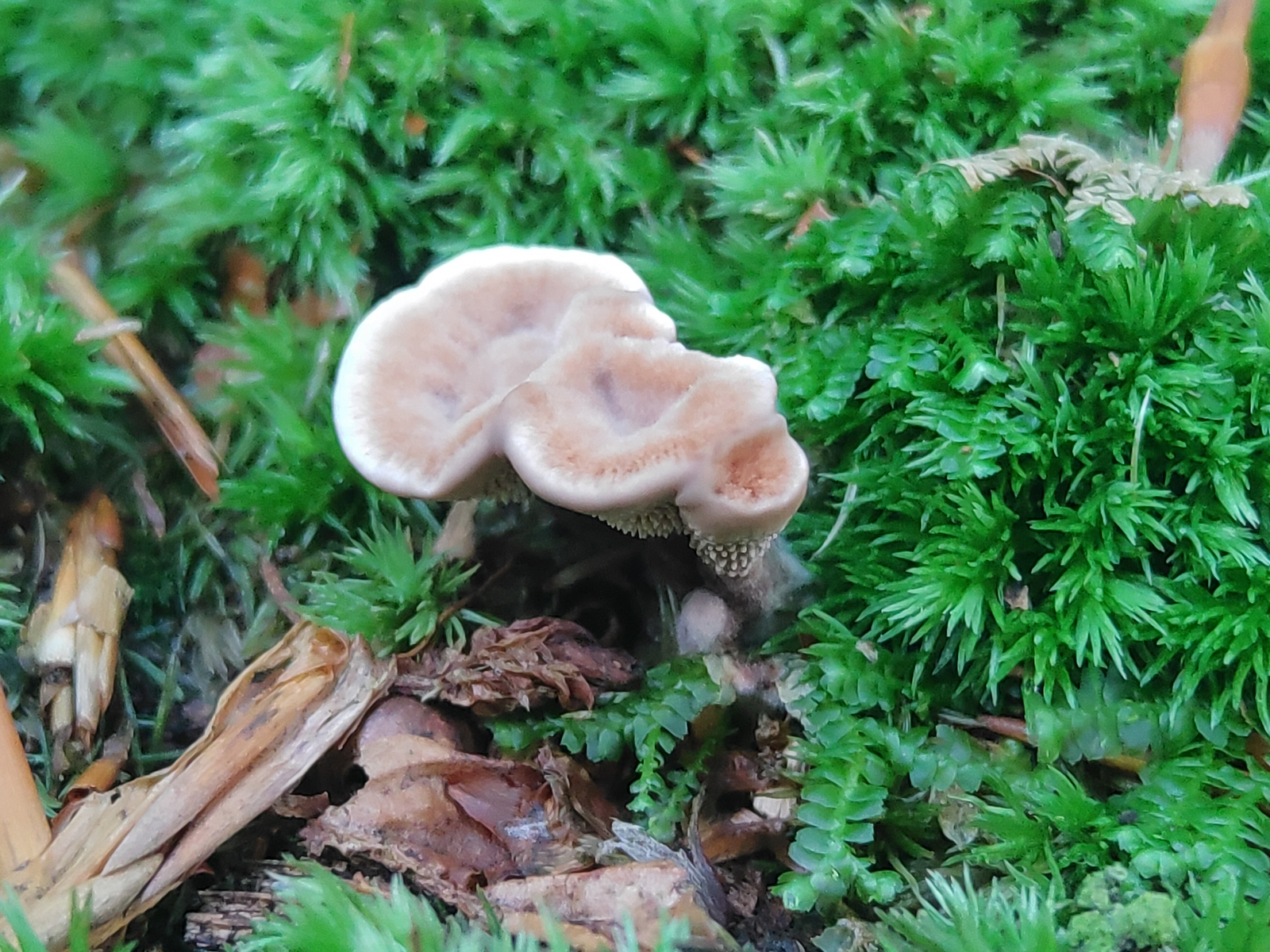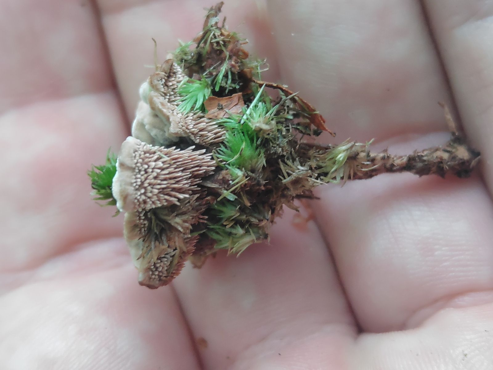 Wie sagte unser Öhrling so schön? Ein Stacheling kommt selten allein! Und tatsächlich konnten wir an diesem Hang eine (oder zwei??) weitere Arten finden, bei denen wir bestimmungstechnisch immerhin mal in der Gattung Hydnellum landen. Dann hören die Fähigkeiten leider auch schon auf, weshalb wir über Hilfe sehr dankbar wären! Leider sind die Fruchtkörper sehr klein, weshalb ich von Geschmacksproben zunächst Abstand genommen habe :). Allerdings bin ich sehr gerne bereit, die Pilzchen zu verschicken ( Beorn, Oehrling?). Die Pilzchen steckten in dicken Moospolstern, der Boden ist zwar tendentiell in der Gegend stark saurer Sandboden, allerdings gibt es durchaus Lehmauflagen. Begleitpilze waren Trompetenpfifferlinge, zimtfarbene Hautköpfe, Gallertkäppchen und eine der Pfifferlingsarten. An dieser Stelle konnte ich auch bereits Kiefernsteinpilze nachweisen. Von den Bäumen dominieren Buchen, dazu kommen vereinzelt Eichen und Kiefern.