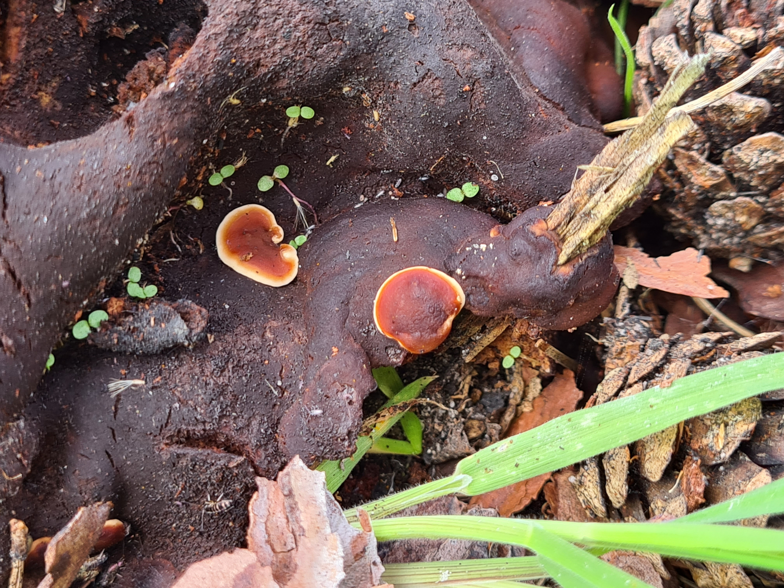 Carina erspähte einen kleinen roten Becherling auf Erde, den ich aufgrund von kaum wahrnehmbarer Behaarung für beachtenswert hielt. Mikroskopisch kam ich dann auf Melastiza flavorubens: