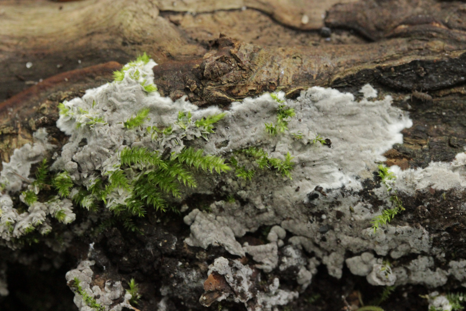 1. Keine Zystiden, Schnallen vorhanden, Subikularhyphen dickwandig, Sporen gelblich, rundlich, (8.3-11.7) x (8.9-11.1) µm, Q=0.9-1.2, Stacheln bis 3 µm, Apikulus amyloid. Damit lande ich dann bei Tomentella bryophila, die ich vor einiger Zeit ja schon mal im Stadtwald hatte.
