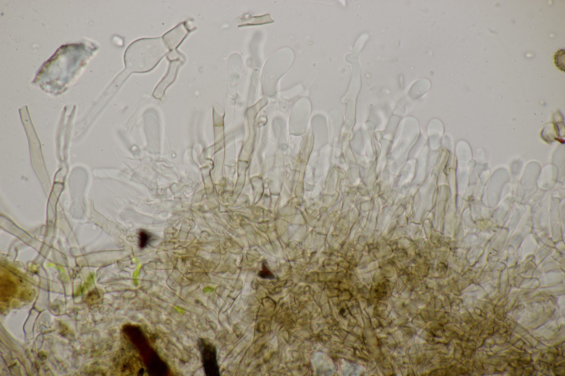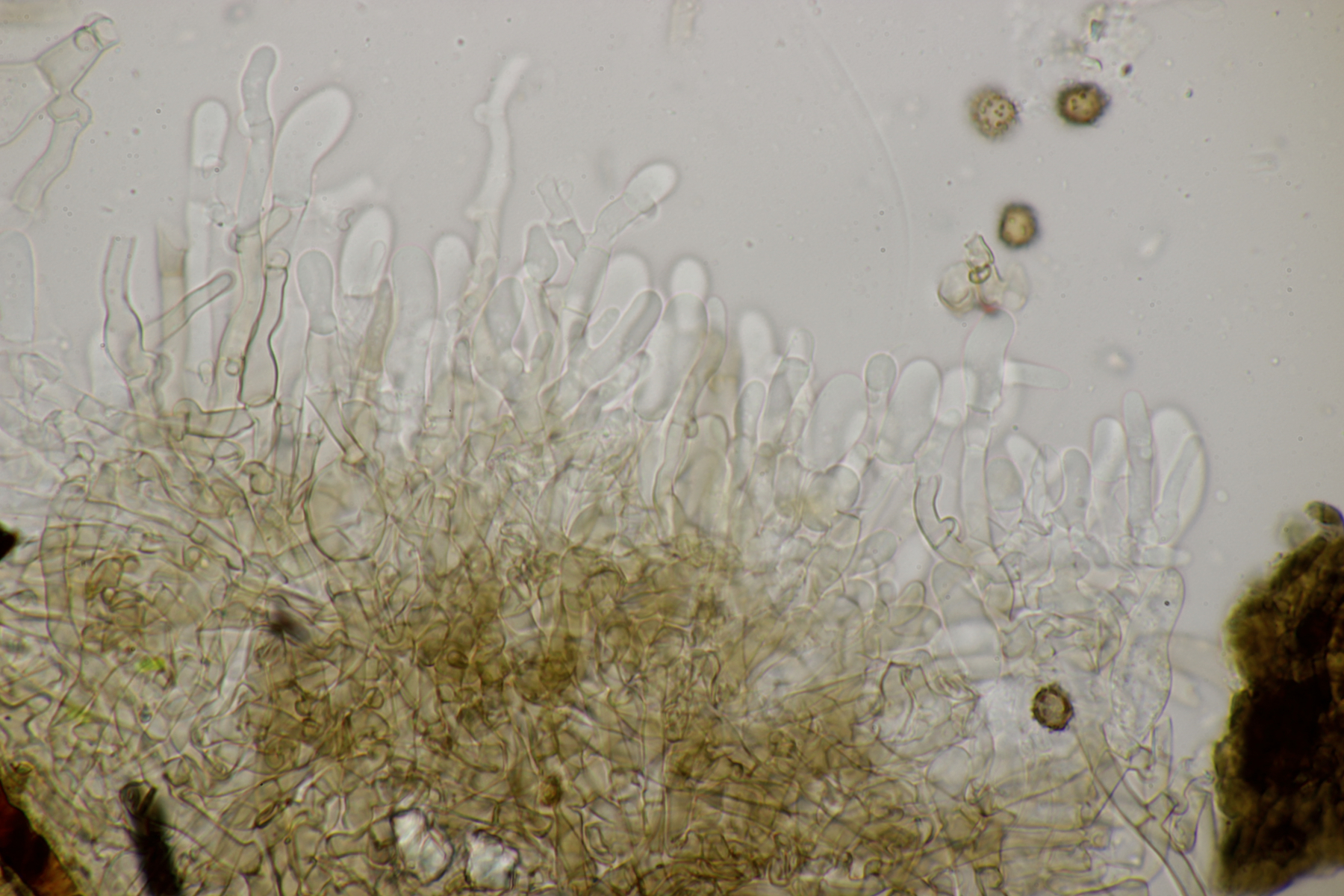 2. Keine Zystiden, Schnallen vorhanden, Sporen bräunlich, unregelmäßig, (7.9-8.9) µm x (6.4-7.8) µm, Q=1.0-1.3, überwiegend mit Öltropfen, Stacheln bis 1.5 µm lang, Hymenophor nicht cyanescent, auffallend waren einige blasig verdickte Hyphen im Subhymenialbereich. Muß ich dann bei Schlüsselschritt 14 nach 29 abbiegen und lande (mal wieder) im undankbaren Thelephora terrestris/Tomentella sublilacina-Sumpf?
