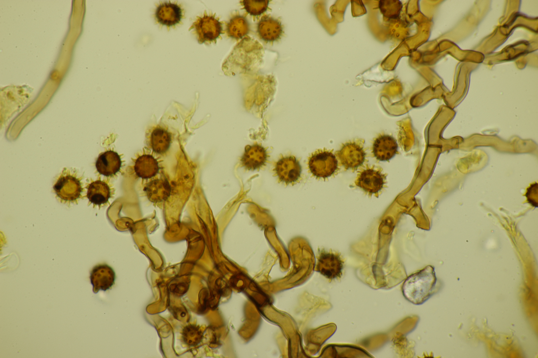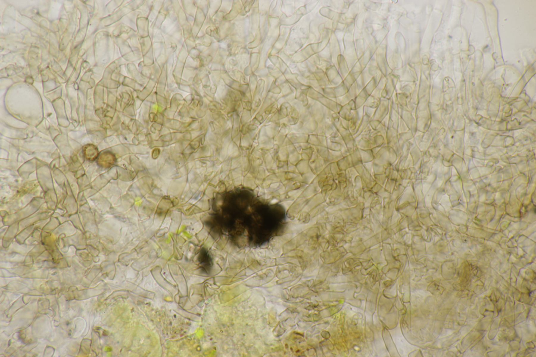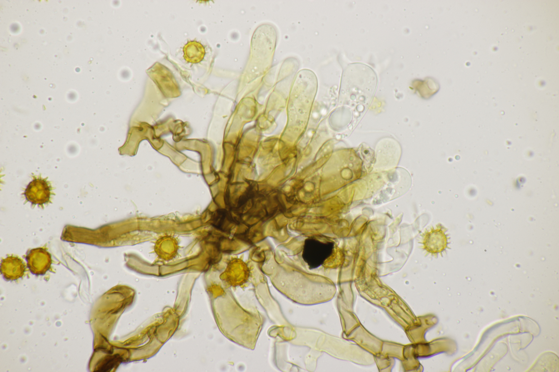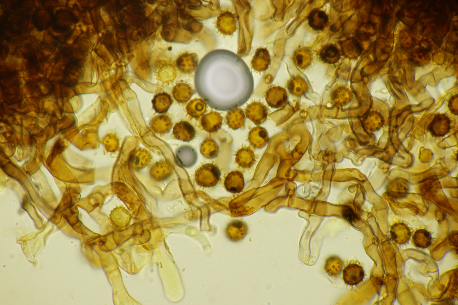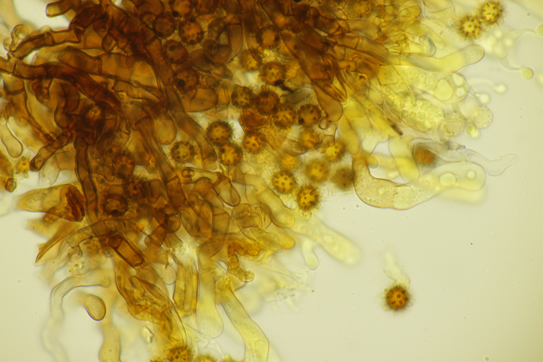 2. Keine Zystiden, Schnallen vorhanden, Sporen bräunlich, unregelmäßig, (7.9-8.9) µm x (6.4-7.8) µm, Q=1.0-1.3, überwiegend mit Öltropfen, Stacheln bis 1.5 µm lang, Hymenophor nicht cyanescent, auffallend waren einige blasig verdickte Hyphen im Subhymenialbereich. Muß ich dann bei Schlüsselschritt 14 nach 29 abbiegen und lande (mal wieder) im undankbaren Thelephora terrestris/Tomentella sublilacina-Sumpf?