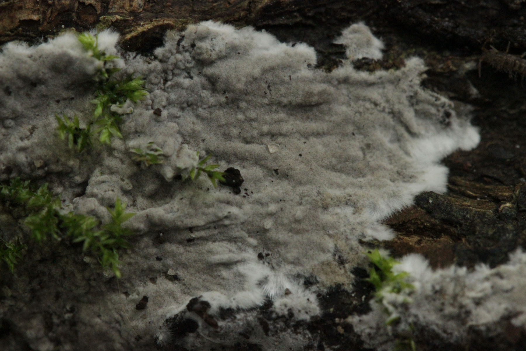 1. Keine Zystiden, Schnallen vorhanden, Subikularhyphen dickwandig, Sporen gelblich, rundlich, (8.3-11.7) x (8.9-11.1) µm, Q=0.9-1.2, Stacheln bis 3 µm, Apikulus amyloid. Damit lande ich dann bei Tomentella bryophila, die ich vor einiger Zeit ja schon mal im Stadtwald hatte.