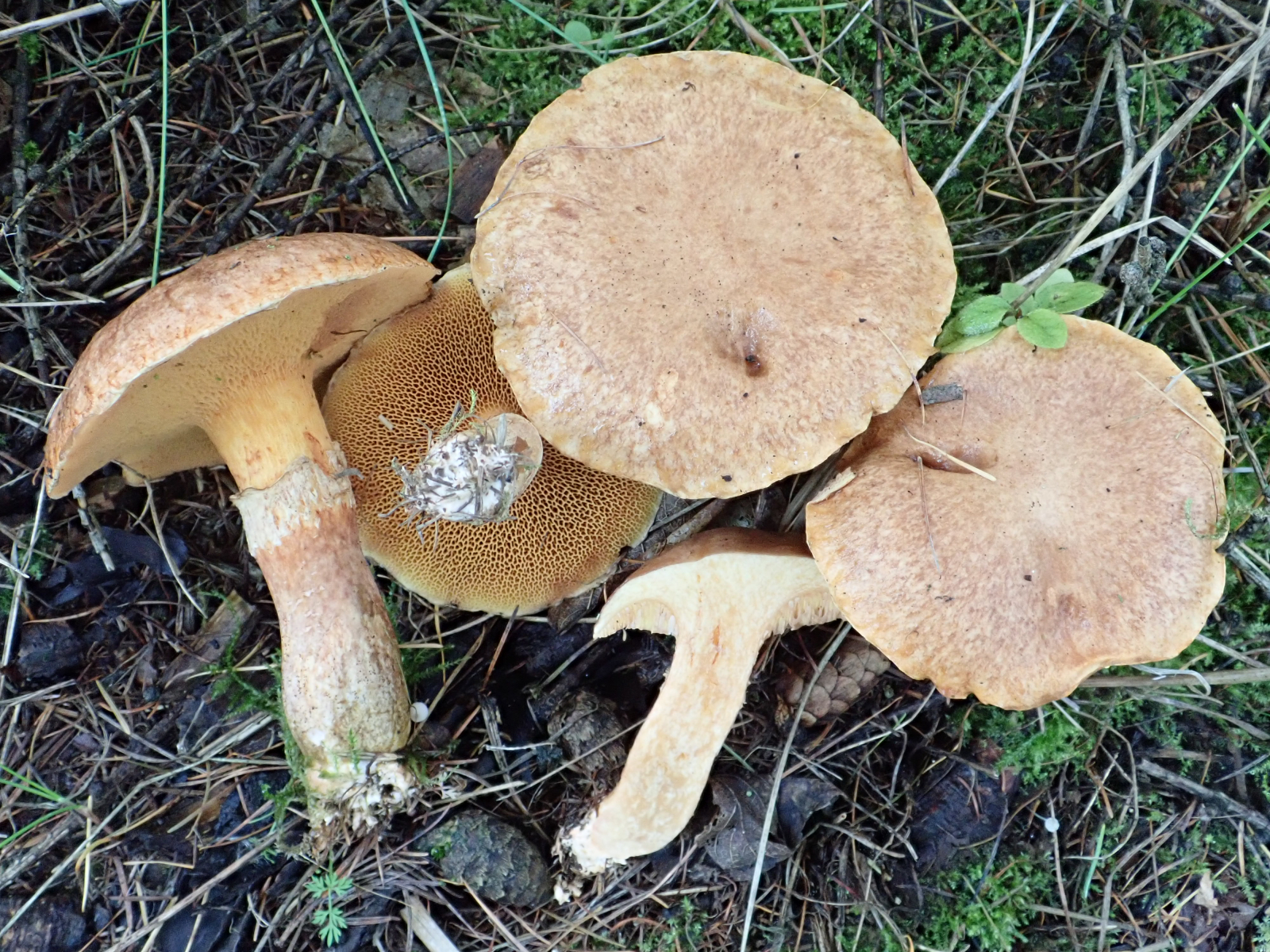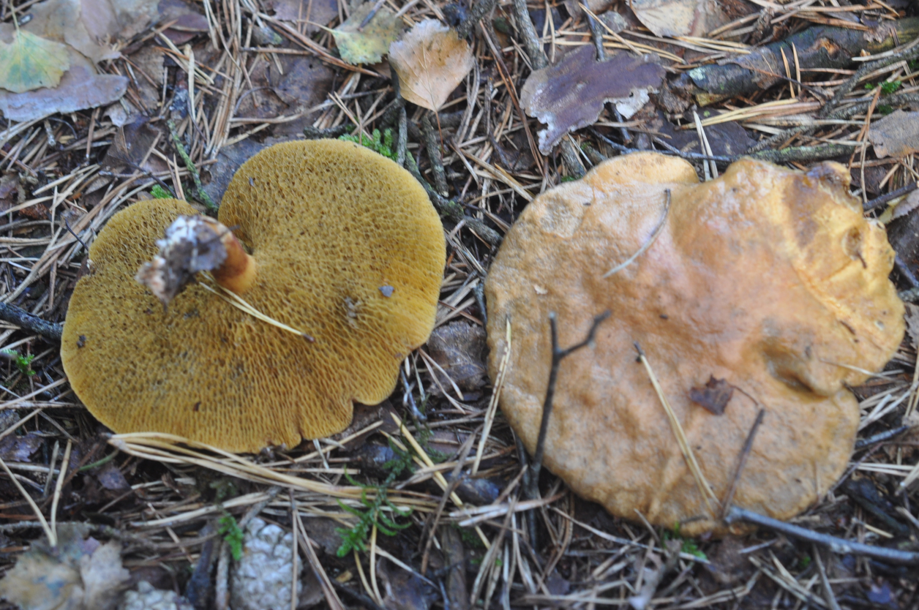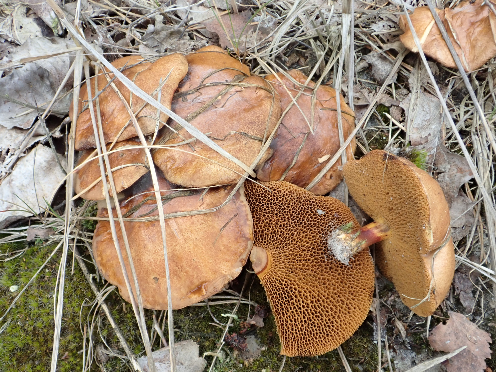 Bei Kiefern (Lärchen waren erst in 50 Meter Entfernung) fanden wir Röhrlinge, die zwar in der Röhrenschicht farblich und strukturmäßig den Rostroten Lärchenröhrlingen ähnelten, die aber eine feuchte Huthaut hatten, die Stiele waren richtig rot wie ein Rotfüßchen ohne Ringzone. Leider gabs nur recht alte Fruchtkörper.