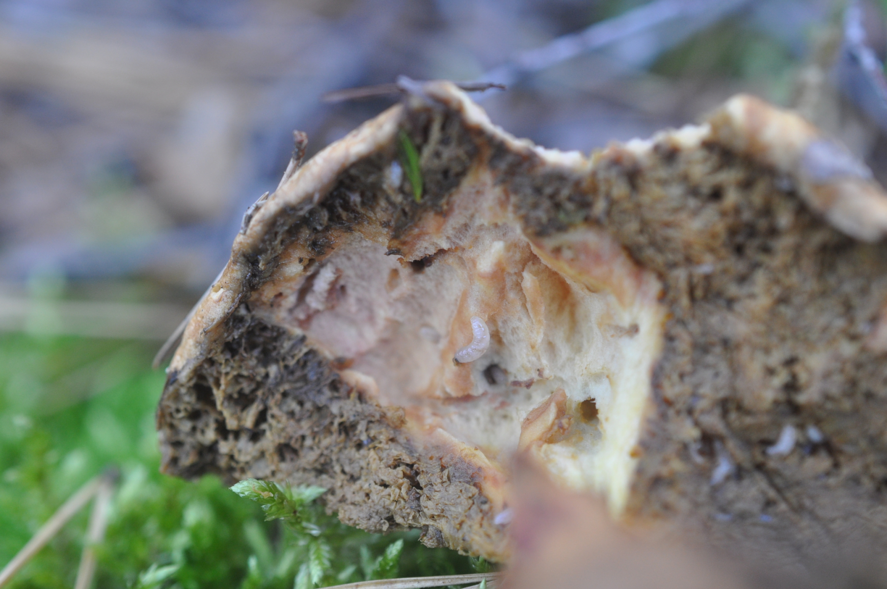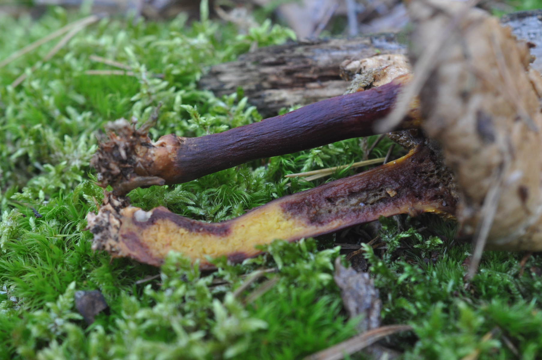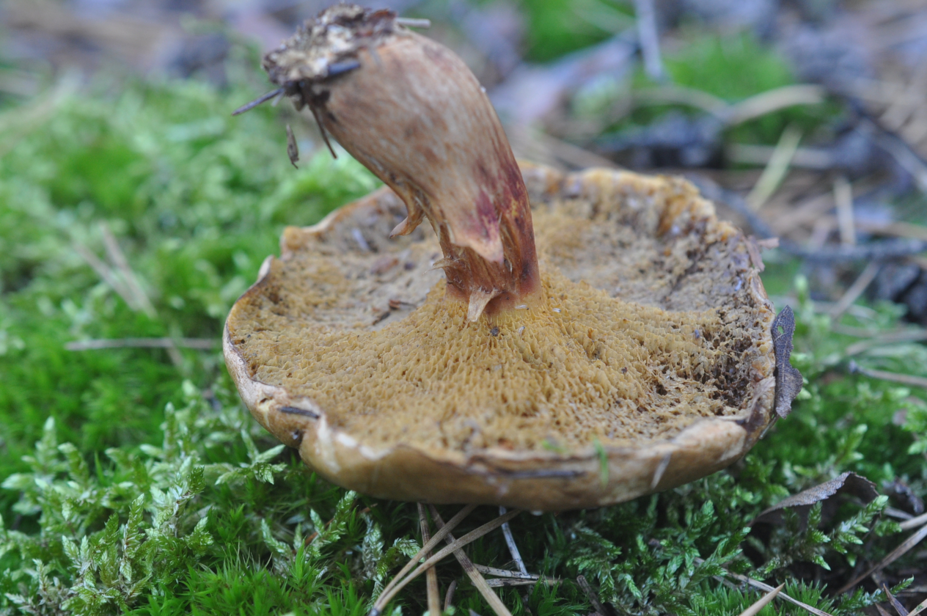 Bei Kiefern (Lärchen waren erst in 50 Meter Entfernung) fanden wir Röhrlinge, die zwar in der Röhrenschicht farblich und strukturmäßig den Rostroten Lärchenröhrlingen ähnelten, die aber eine feuchte Huthaut hatten, die Stiele waren richtig rot wie ein Rotfüßchen ohne Ringzone. Leider gabs nur recht alte Fruchtkörper.