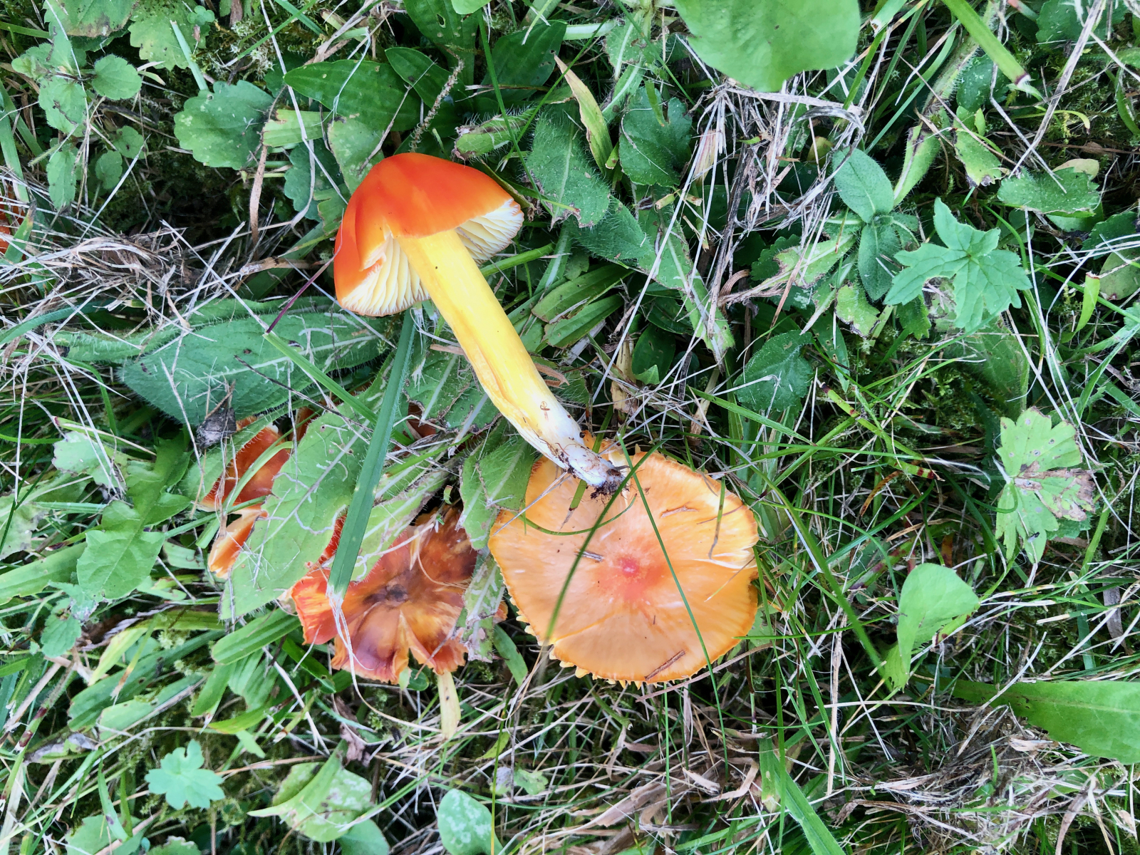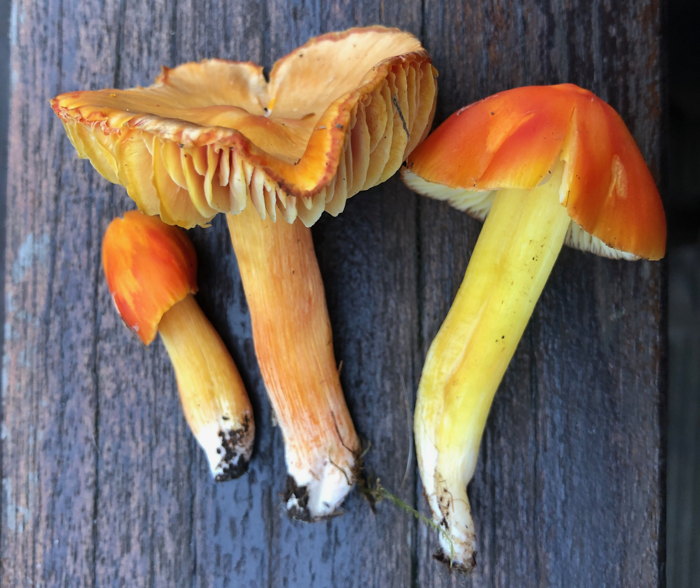 Bei dem ersten, dem großen orangefarbenen Saftling bitte ich um Bestätigung, da ich ihn noch nie gefunden habe. Die Mikromerkmale würden jedenfalls passen. Geruch und Geschmack waren neutral. Der Pilz ist relativ groß für einen Saftling mit 5 cm Hutdurchmesser und 6 cm Stiellänge.