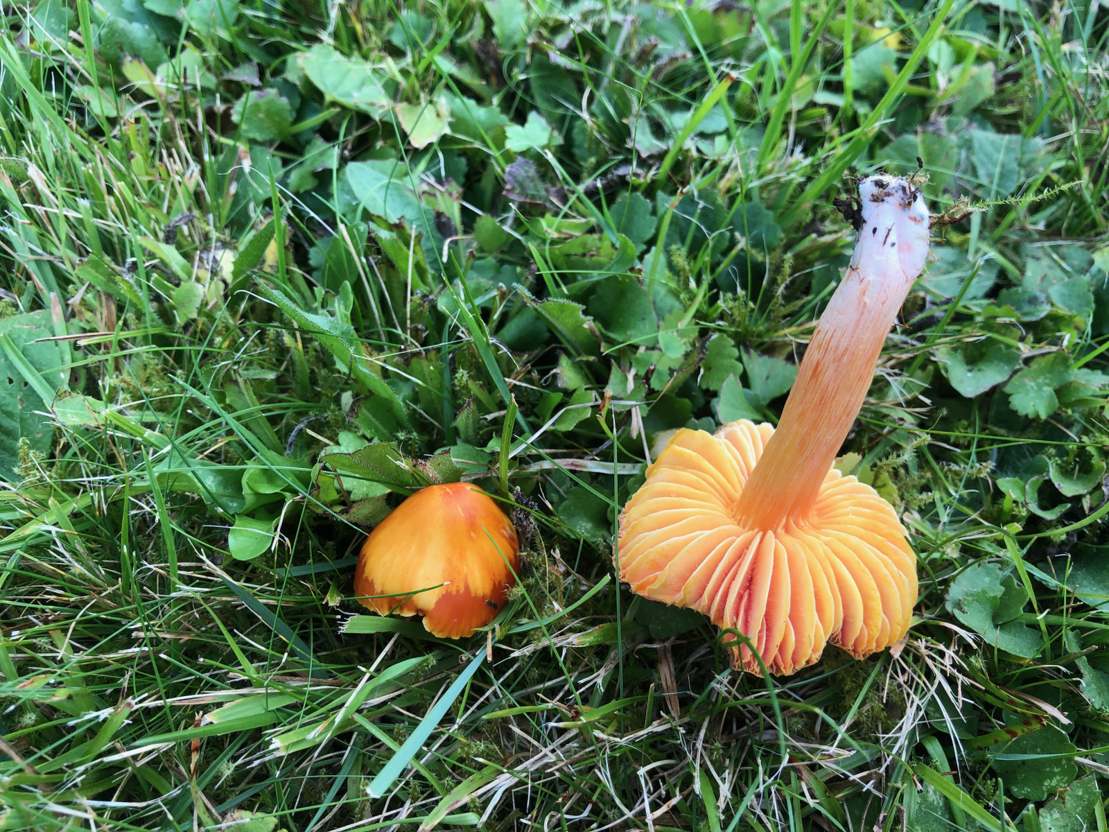 Bei dem ersten, dem großen orangefarbenen Saftling bitte ich um Bestätigung, da ich ihn noch nie gefunden habe. Die Mikromerkmale würden jedenfalls passen. Geruch und Geschmack waren neutral. Der Pilz ist relativ groß für einen Saftling mit 5 cm Hutdurchmesser und 6 cm Stiellänge.