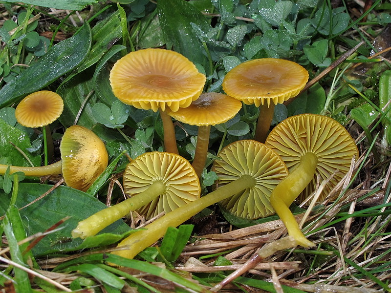Leider habe ich in den letzten Wochen arbeitsbedingt keine Zeit gehabt ernsthaft einen Wald aufzusuchen, trotzdem ist natürlich der Drang zu schwammern da und so schleich ich mich halt in der Mittagspause auf der Wiese ums Gebäude rum. Am Geländerand stehen Kiefern, einzelne Eichen und Buchen, die auch für Schatten sorgen, sodass die Wiese erstaunlicherweise gar nicht so trocken ist. Sie wird regelmäßig gemäht aber eher nicht gedüngt und besteht vermutlich seit der Bauzeit in den 90er Jahren so. Insgeheim habe ich schon lange gehofft da könnten sich mal ein paar Saftlinge oder dergleichen zeigen- aber was mich dort letzte Woche erwartete, hat mich schier aus den Latschen gekippt. In einem ca 10x20m großen Areal war alles voll davon. Bestimmt teilweise 20 Saftlinge pro Quadratmeter. Die Wiese war gelb wie sonst im Sommer mit Muichschegln (Löwenzahn) ==Gnolm16! Gigantisch. Natürlich musste ich mir das gleich aus der Nähe anschauen- vermutlich habe ich nun in der Arbeit meinen Ruf weg (ich hör sie schon "der Ingo sammelt bestimmt Drogenpilze!!!"). Naja mir ists wurscht, ich bin immer noch total geflashed (Mist, falsches Wort...nur vom Anblick natürlich!!). Zu meiner Verteidigung muss ich sagen dass ich noch nie einen Saftling gefunden habe und damit so gut wie alles für mich Erstfunde sind.