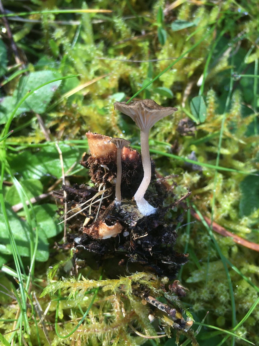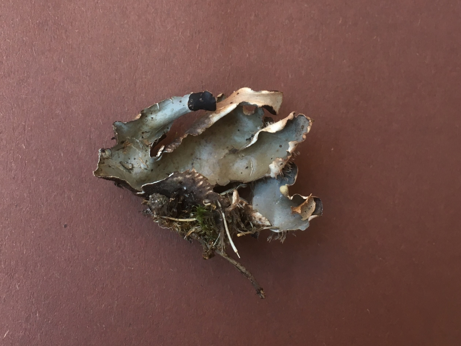 Den nächsten kenne ich besser, denn wenn die kleinen braunen Schirmchen da definitiv auf der Schildflechte wachsen, dann ist das Arrhenia peltigerina, der Schildflechten-Nabeling. Interessant ist die Schildflechte auf der der Pilz dort offensichtlich wächst. Man kann von dieser zwar nicht allzu viel erkennen, aber das was man sieht deutet auf Peltigera neckeri, eine in Norddeutschland schon beinah ausgestorbene, in Süddeutschland aber wohl noch nicht ganz so seltene Art.