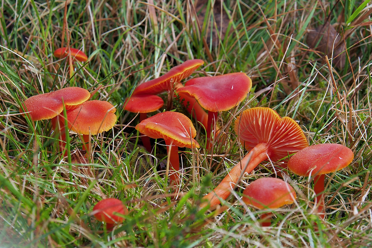 die fraglichen Hygrocybe miniata müssten jetzt ja schon etwas weiter entwickelt sein und eventuell so aussehen wie auf dem folgenden Foto.