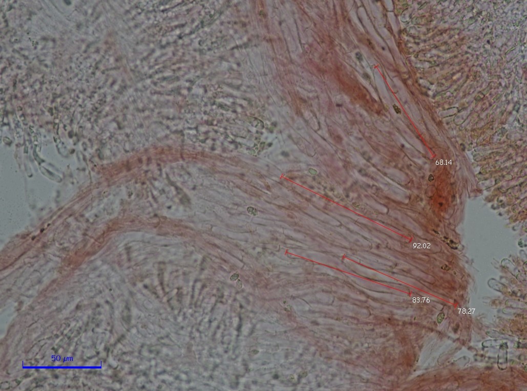 Zusätzlich zur Mikroskopie der Lamellentrama würde ich auch noch einen weiteren Sporenabwurf untersuchen, nach Möglichkeit von einem etwas älteren, voll aufgeschirmten Fruchtkörper. Die Zellen der Lamellentrama kann man problemlos im Verbund vermessen, einfach ein kleines Stück einer nicht zu dicken Lamelle zwischen Objekträger und Deckgläschen positionieren, etwas quetschen und dann mikroskopieren. Ob es sich um eine subreguläre Lamellentrama (mit kurzen Zellen) oder um eine reguläre Lamellentrama (mit langen Zellen) handelt, ist sofort zu erkennen (der Unterschied ist sehr groß).