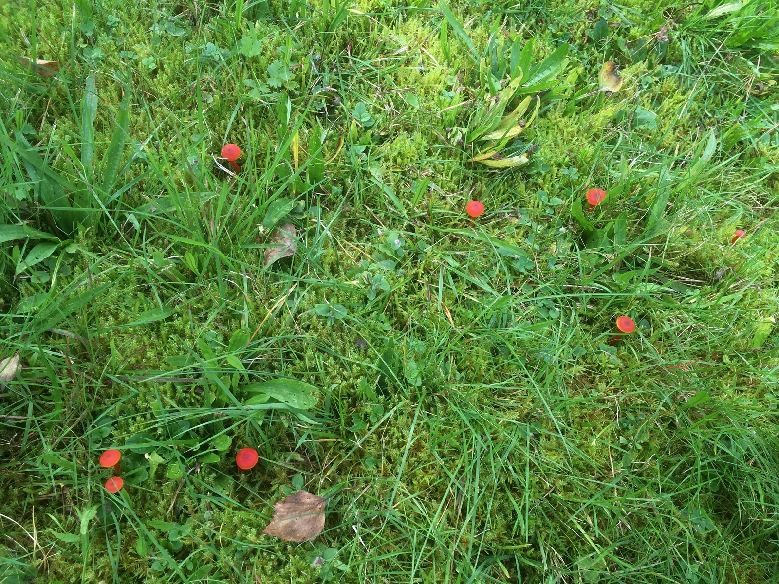 die fraglichen Hygrocybe miniata müssten jetzt ja schon etwas weiter entwickelt sein und eventuell so aussehen wie auf dem folgenden Foto.