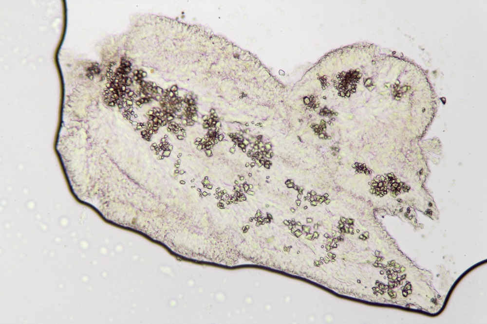 Es gibt keine KOH Reaktion, Zystiden sind vorhanden und es gibt auch reichlich Kristalle die nicht KOH löslich sind.