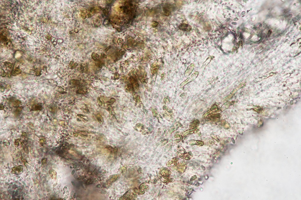 Es gibt keine KOH Reaktion, Zystiden sind vorhanden und es gibt auch reichlich Kristalle die nicht KOH löslich sind.