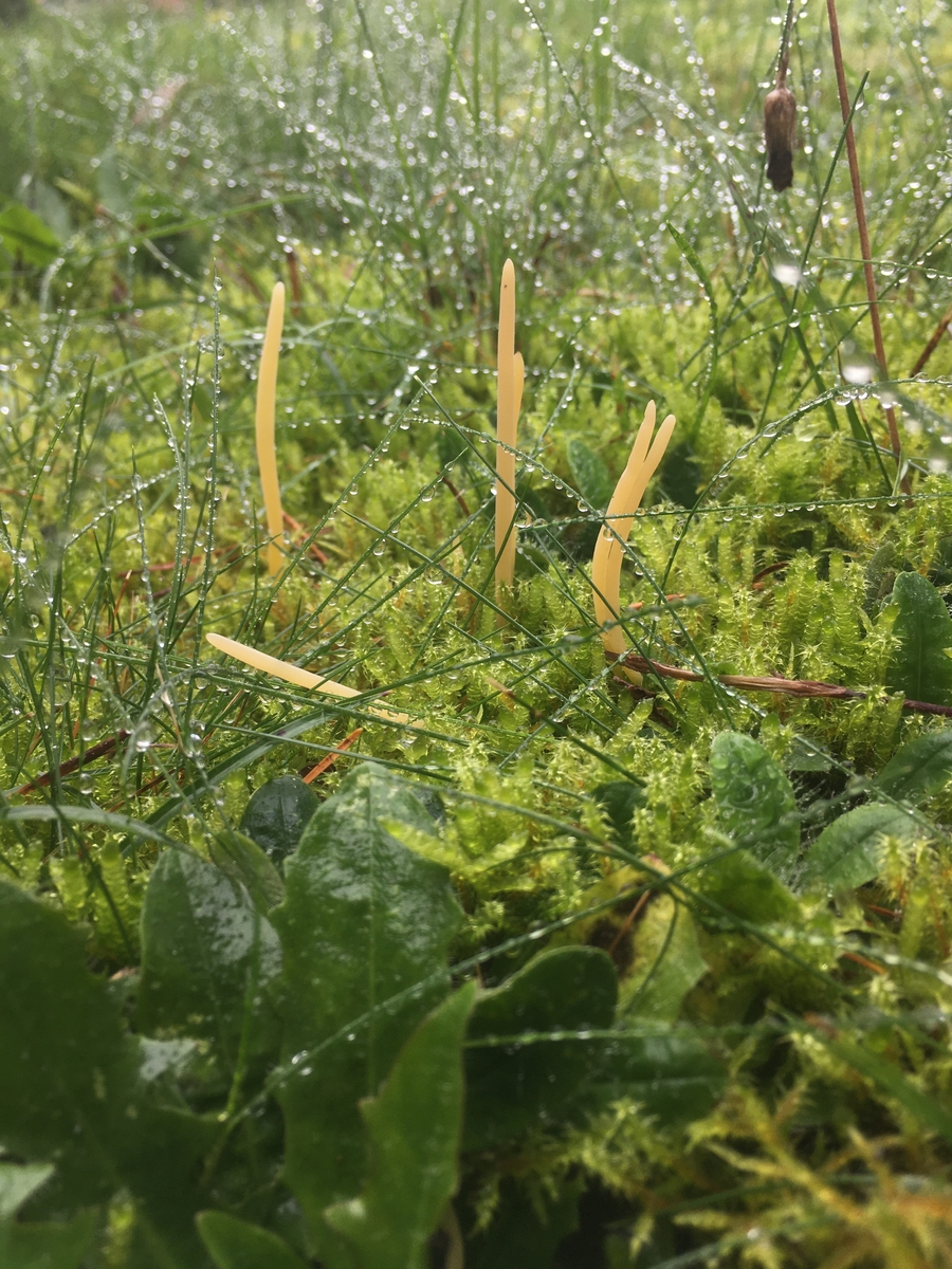 Leicht zu übersehen da als trockene Grashalme getarnt und von all den knalligen Saftlingen überblendet habe ich die kleinen Keulchen und Würmchen oft erst bei weiteren Besuchen meiner neuen Spielwiese entdeckt. Ich fand sie nicht minder faszinierend. Auch mit denen hatte ich mich bisher mangels Funden noch nie beschäftigt und so war ich erstaunt dass viele dieser schlanken Ranken sogar Ständerpilze sind- ich hatte sie eher für Ascos gehalten. Schön blöd- daher habe ich auch großzügig welche eingesteckt in der Annahme sie wären leicht zu mikroskopieren. Tja.... Na ok, ich bin eigentlich schon irgendwie zurecht gekommen, allerdings wollten manche partout nicht absporen so dass ich mehrere Anläufe gebraucht habe. Um im vorhinein zu wissen welche Merkmale wohl wichtig sein könnten habe ich schon mal Makroskopisch selektiert was infrage kommen könnte- witzigerweise leiteten mich die Sporen dann oft ganz woanders hin. Sie scheinen es einem also mal wieder auch nicht allzu leicht zu machen.