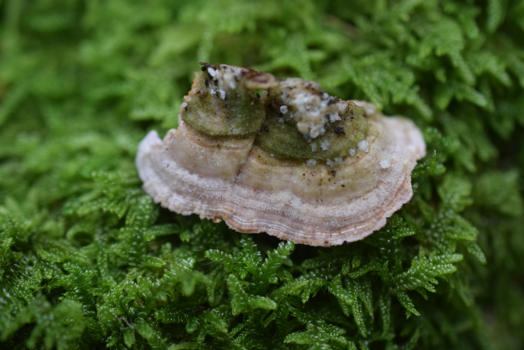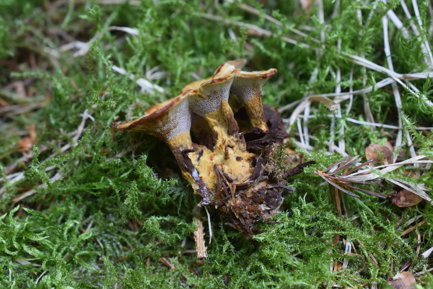 Coltricia perennis , ein Gigant , so dicke Stiel ?. Auf den ersten blick war ich von der Große verwirrt , aber ich stellte fest , das mehrere Exemplare zu einem zusammengewachsen waren